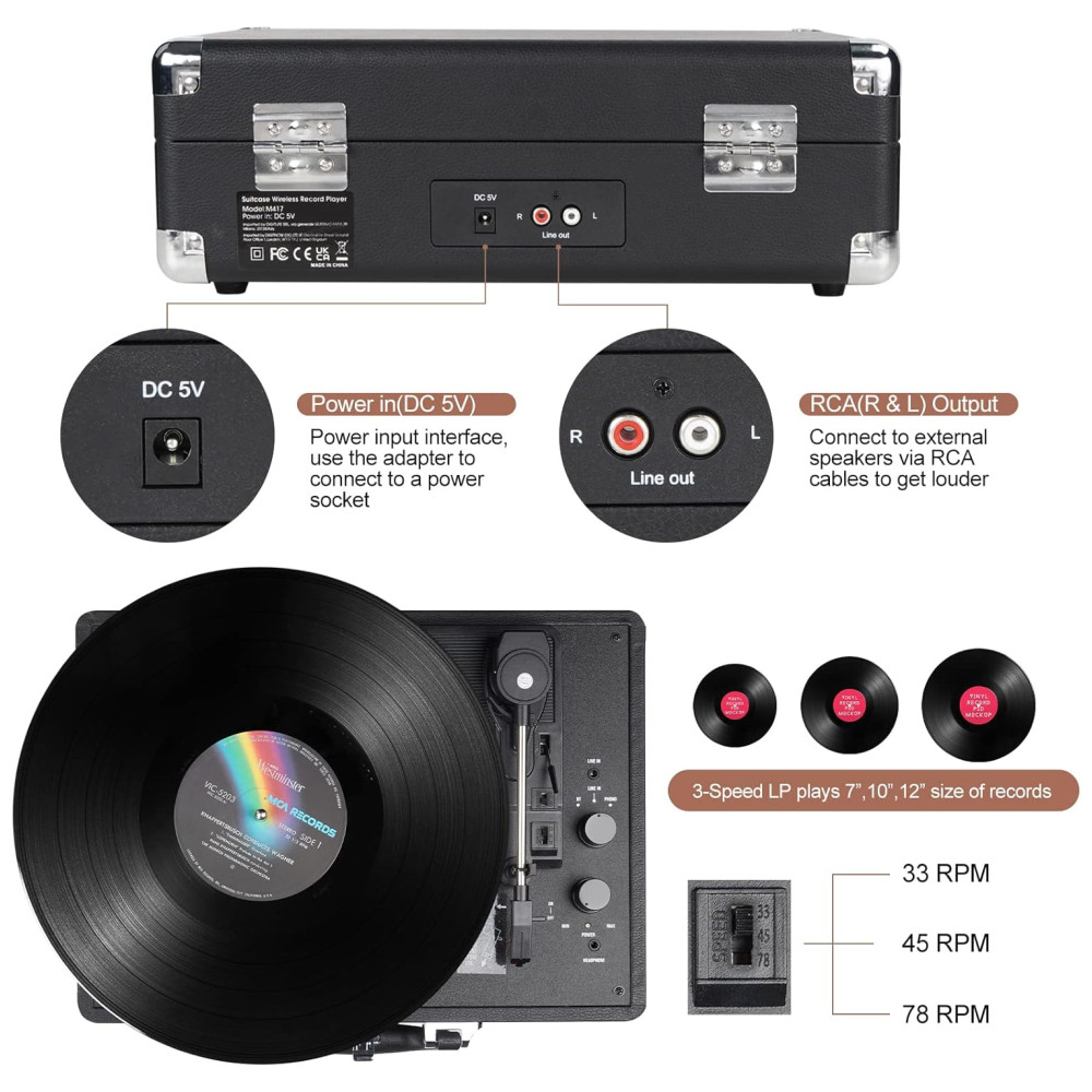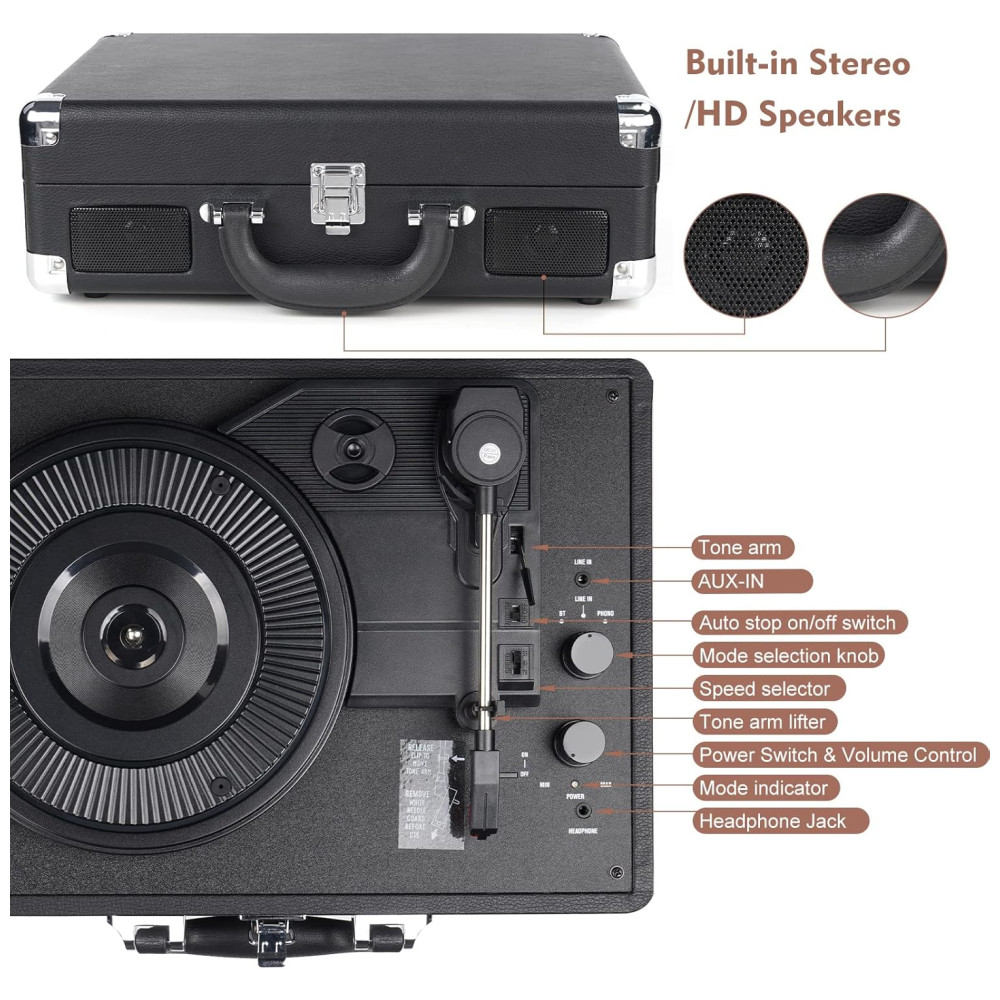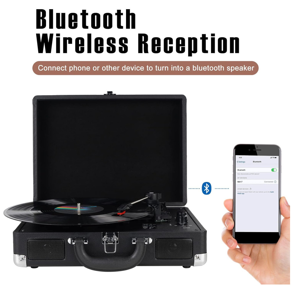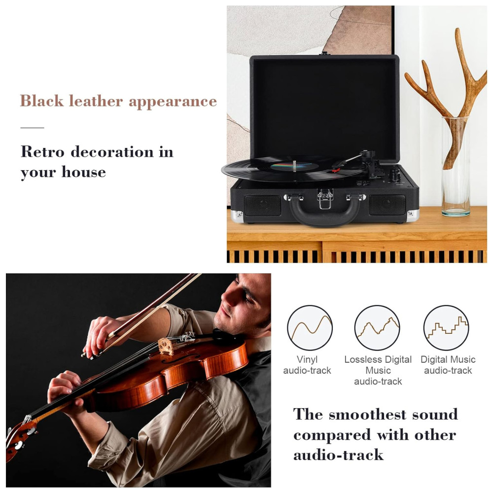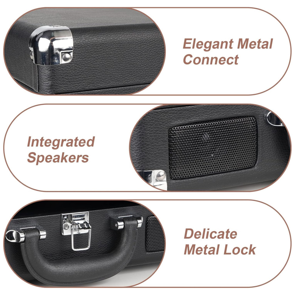 Elegante toca discos de vinil autônomo com estilo vintage. Design de pasta , mala para fácil portabilidade e aparência elegante.