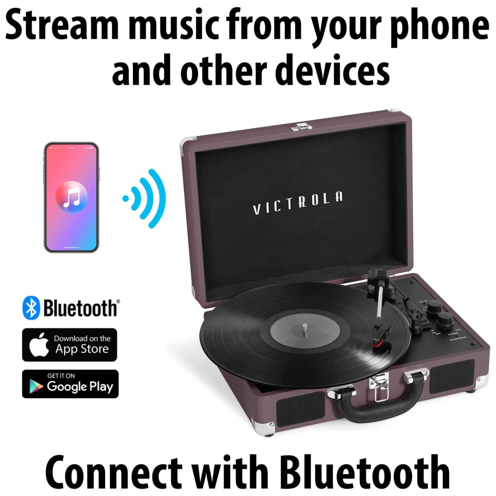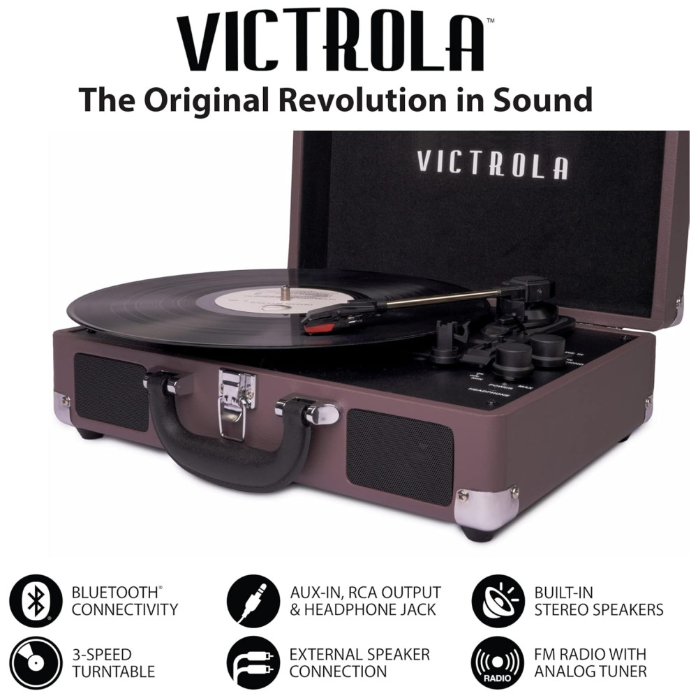 LEVE SUAS MÚSICAS PARA QUALQUER LUGAR Alojado em uma mala vintage com uma alça de transporte fácil, a mistura de design retrô e contemporâneo da Victrola oferece a máxima flexibilidade para ouvir música onde você quiser e como quiser uma ótima opção para os amantes de vinil