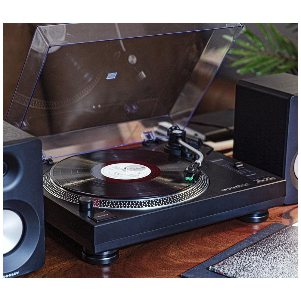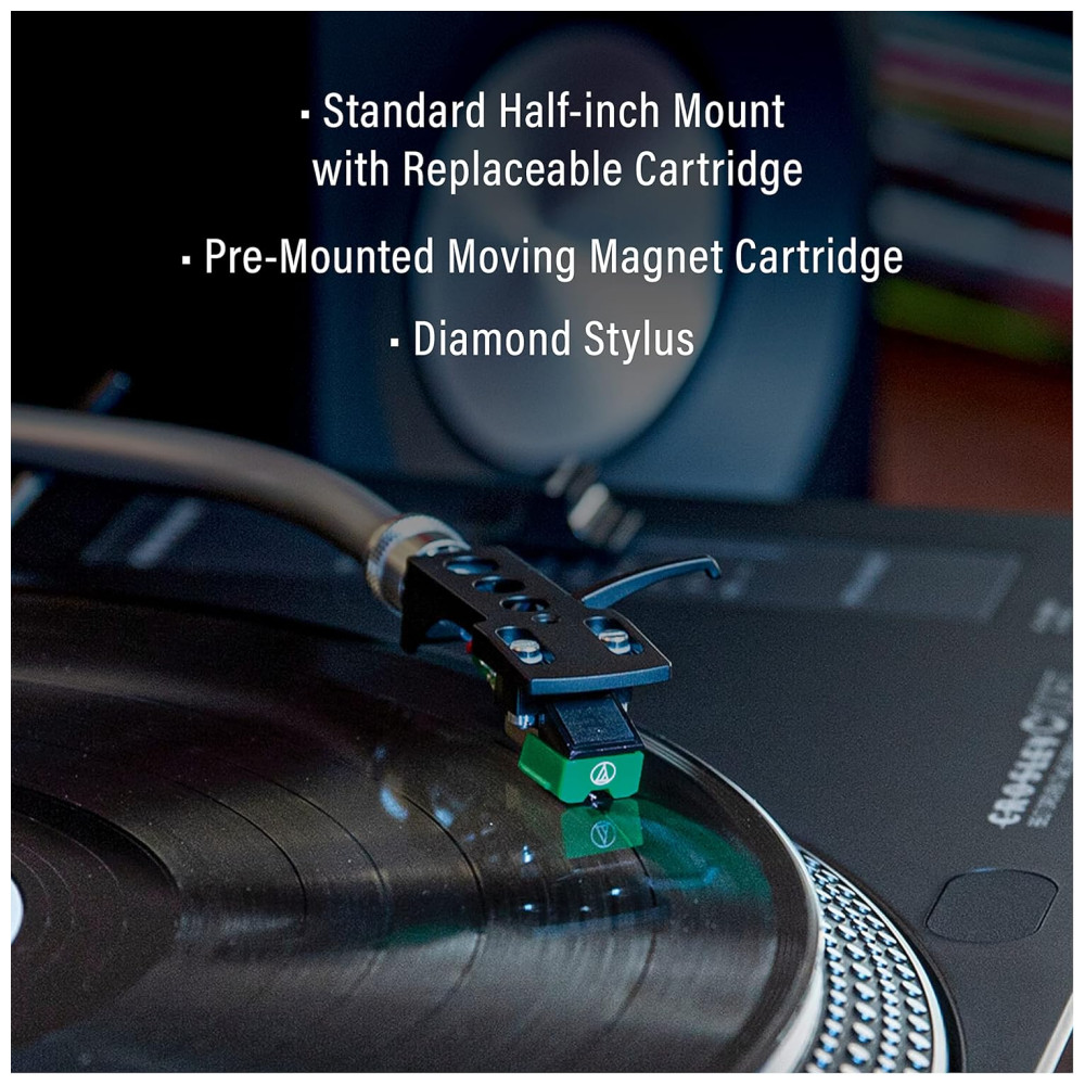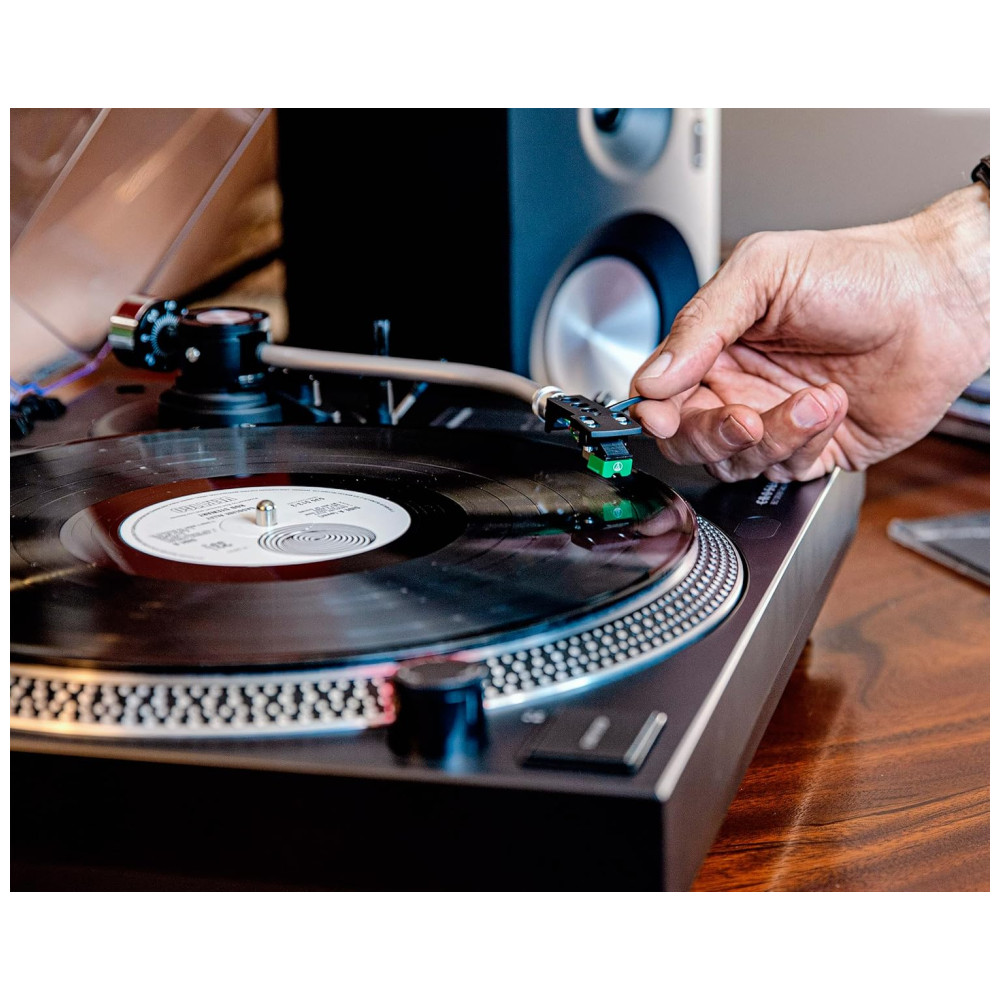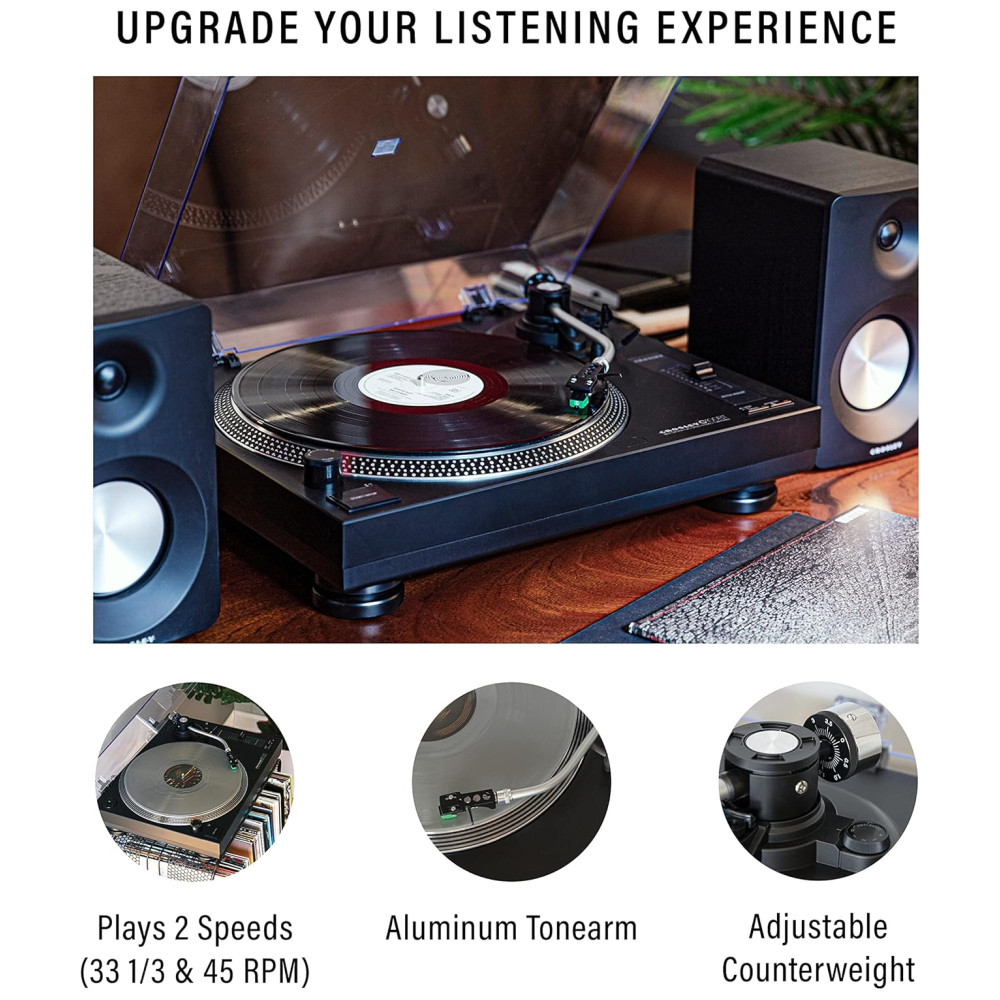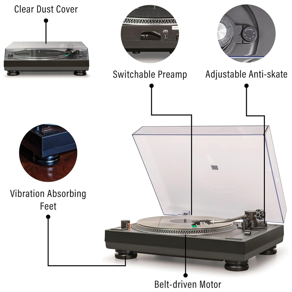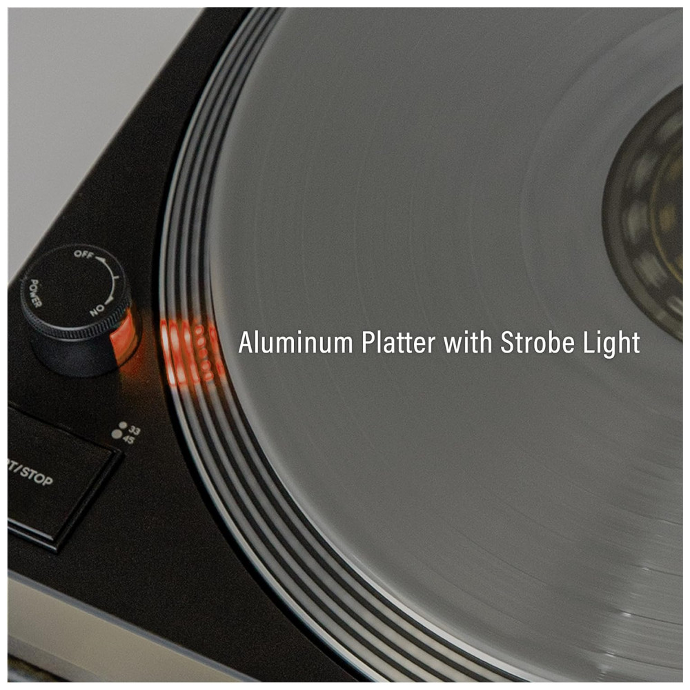 Esta vitrola/ toca discos com acionamento por correia de duas velocidades é capaz de reproduzir discos de 33, 13 e 45 RPM, e vem com um tapete deslizante e um adaptador. Ele possui um prato estroboscópico de alumínio e controle de pitch ajustável, o que proporciona uma velocidade de gravação precisa. O braço de alumínio em forma de S possui uma alavanca de sinalização, um contrapeso ajustável e controle antiderrapante, permitindo que você abaixe a agulha em seu disco favorito com confiança. O cabeçote removível permite atualizações para seu cartucho, enquanto a tampa transparente contra poeira protege seu toca discos de vinil, mesmo quando em uso.