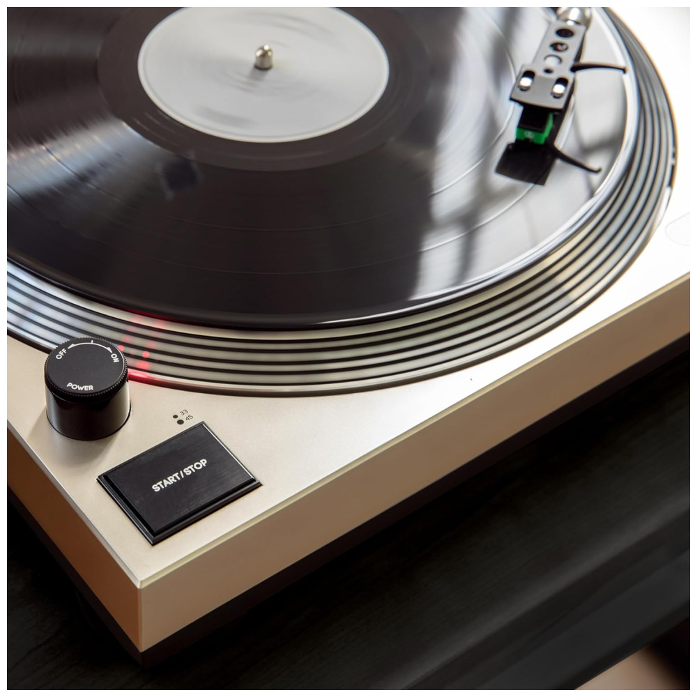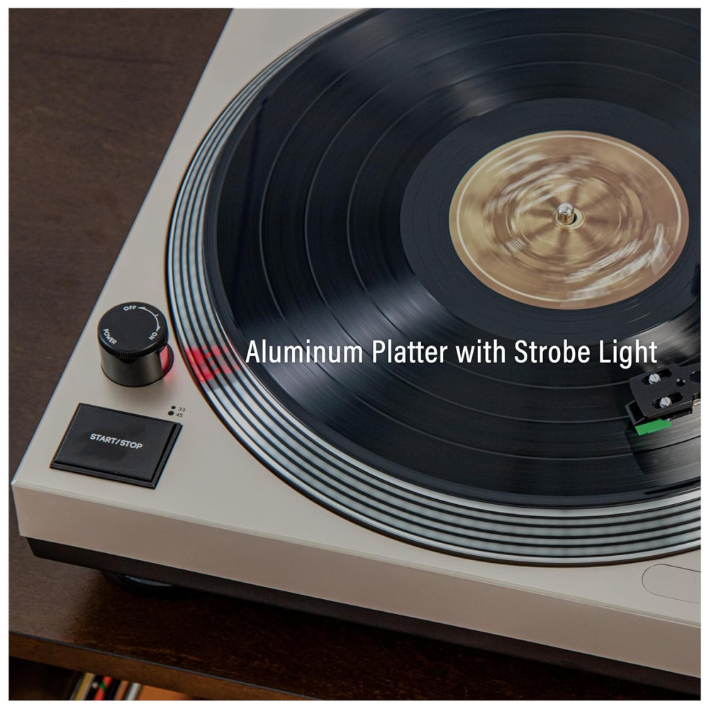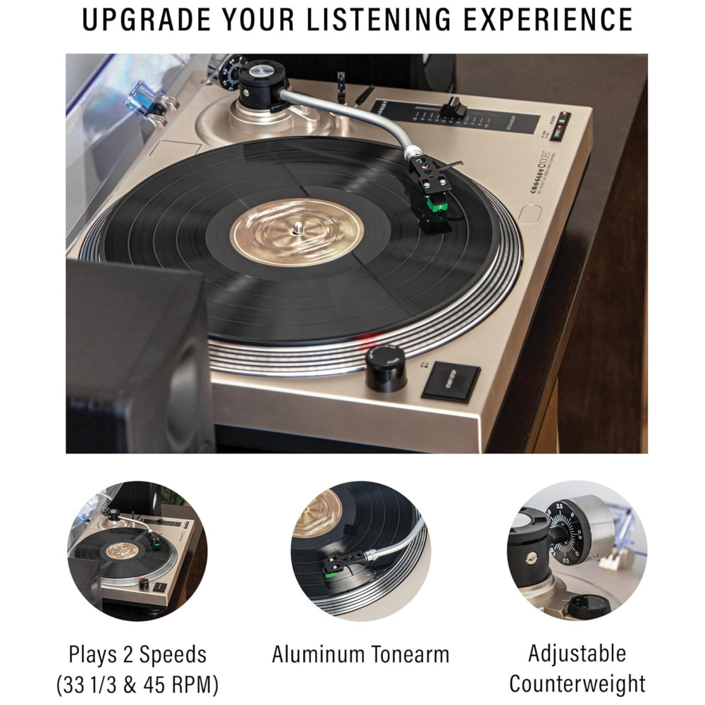 Esta vitrola/ toca discos com acionamento por correia de duas velocidades é capaz de reproduzir discos de 33, 13 e 45 RPM e inclui um tapete deslizante e um adaptador. O prato estroboscópico de alumínio e o controle de pitch ajustável proporcionam uma velocidade de gravação precisa. O braço de alumínio em forma de S com uma alavanca de sinalização, um contrapeso ajustável e controle antiderrapante permitem que você abaixe a agulha em seu disco favorito com confiança. O cabeçote removível permite atualizações para seu cartucho, enquanto a tampa transparente contra poeira protege seu toca discos de vinil mesmo quando em uso. O cartucho AudioTechnica de ímã móvel pré montado oferece qualidade de som premium, enquanto o motor síncrono de baixa vibração e os pés de amortecimento de ressonância eliminam a interferência. Você pode usar o Bluetooth integrado para conectar se a alto falantes ou fones de ouvido sem fio. O pré amplificador comutável permite que você conecte ao seu sistema estéreo ou alto falantes externos amplificados. Este produto apresenta um design vintage combinado com tecnologia moderna e é orgulhosamente projetado nos EUA.