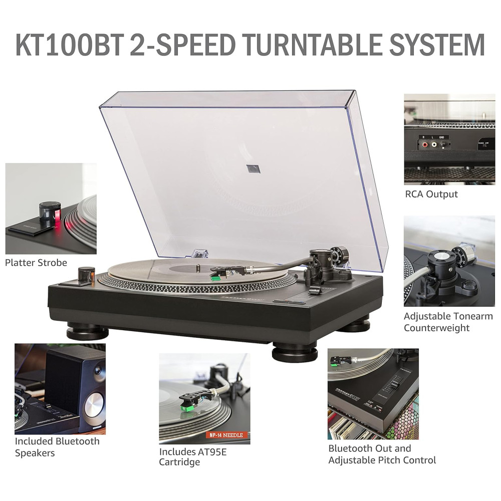 Este toca discos vitrola é capaz de reproduzir discos de 33, 13 e 45 RPM, incluindo um tapete e um adaptador. Possui um prato estroboscópico de alumínio e um controle de pitch ajustável que proporciona velocidade de gravação precisa. O braço de alumínio possui uma alavanca de sinalização, um contrapeso ajustável e controle antiderrapante, permitindo que você abaixe a agulha em seu disco favorito com confiança. O cabeçote removível permite atualizações para seu cartucho, enquanto a tampa transparente contra poeira protege seu toca discos mesmo quando em uso. Este toca discos de vinil possui um cartucho de ímã móvel AudioTechnica pré montado para qualidade de som premium. O motor síncrono de baixa vibração e os pés de amortecimento de ressonância eliminam a interferência para uma reprodução suave. Com conectividade Bluetooth, você pode reproduzir discos de vinil do toca discos ou transmitir música digital do seu telefone através dos alto falantes de estante de gama completa 30 W RMS 60 W Pico por alto falante 30 W Potência máxima Resposta de frequência 40 Hz 20 KHz. Você pode conectar de várias maneiras, usando o pré amplificador embutido e conectando diretamente ao seu receptor usando a saída RCA ou desligando o pré amplificador do toca discos para conectar ao seu próprio sistema estéreo.