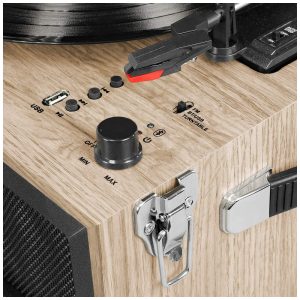 Características toca discos de 3 velocidades, conectividade Bluetooth, rádio FM, reprodutor USB gravador