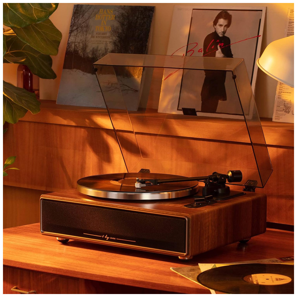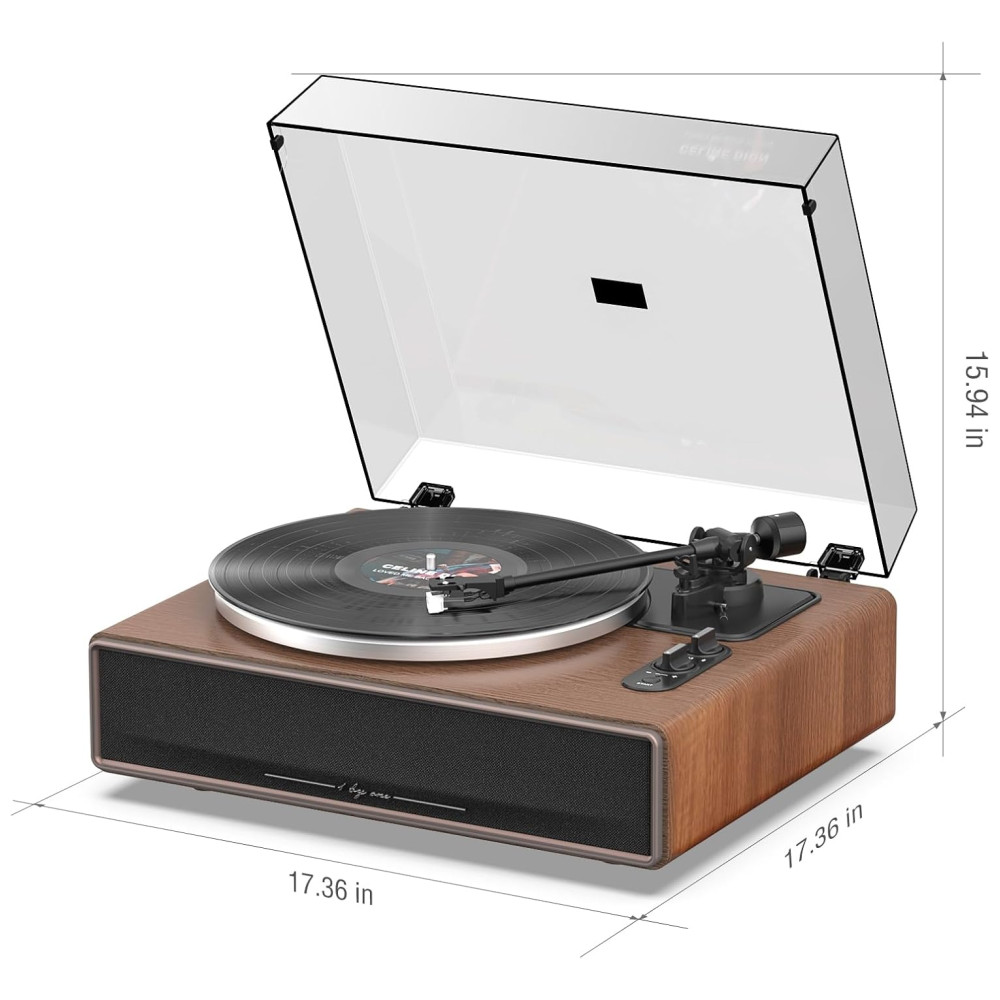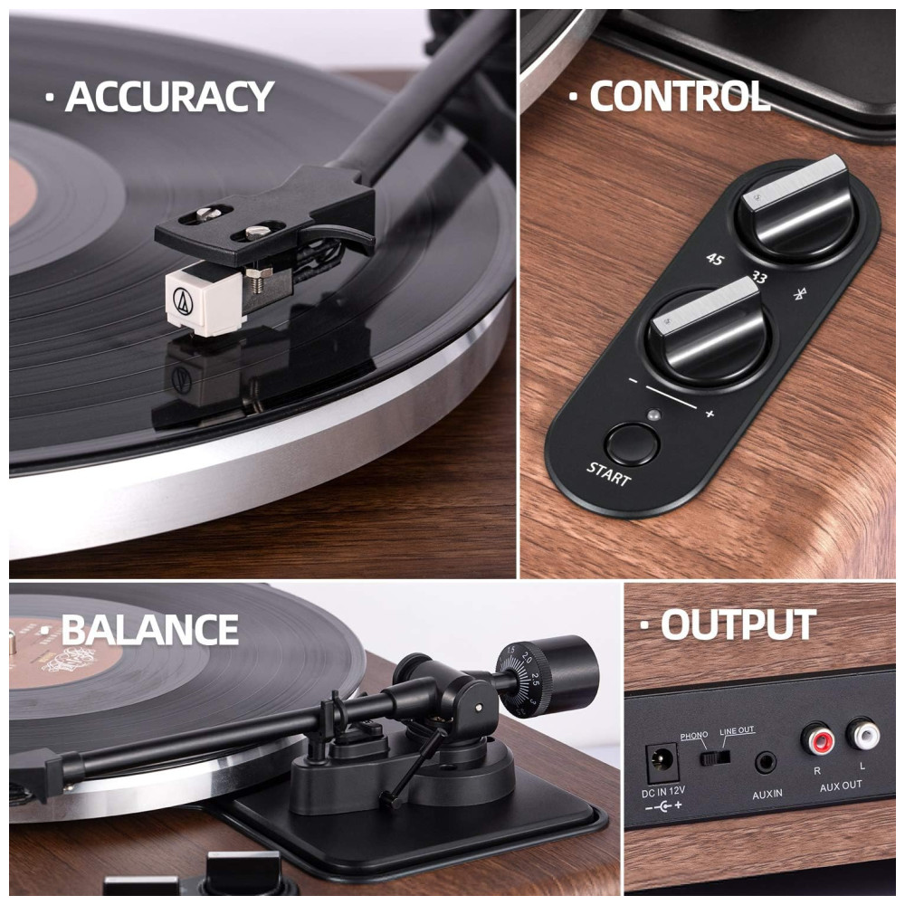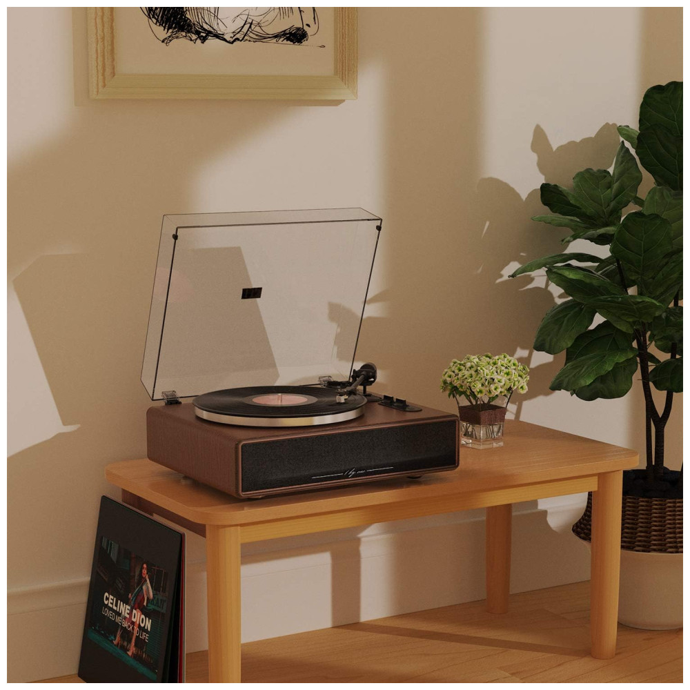 Tudo em 1, este toca discos gira em velocidades de 33 e 45 RPM, o alto falante do toca discos pode tocar música de outros dispositivos sem fio ou usando a porta Aux in e o amplificador embutido permite a conexão com seus próprios alto falantes alimentados externamente