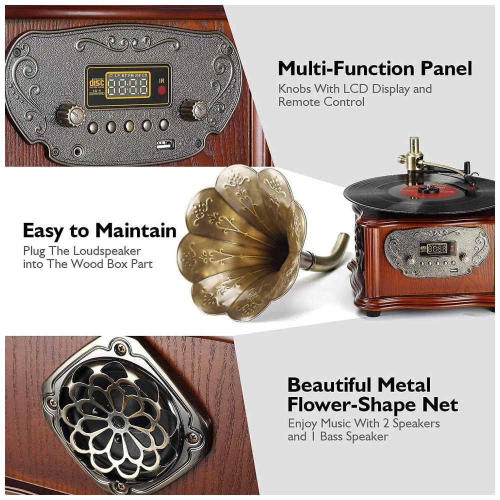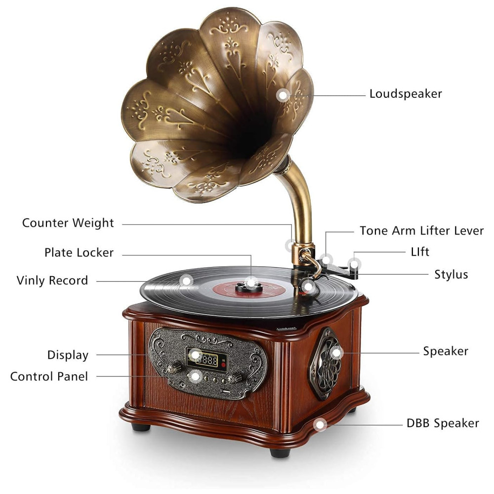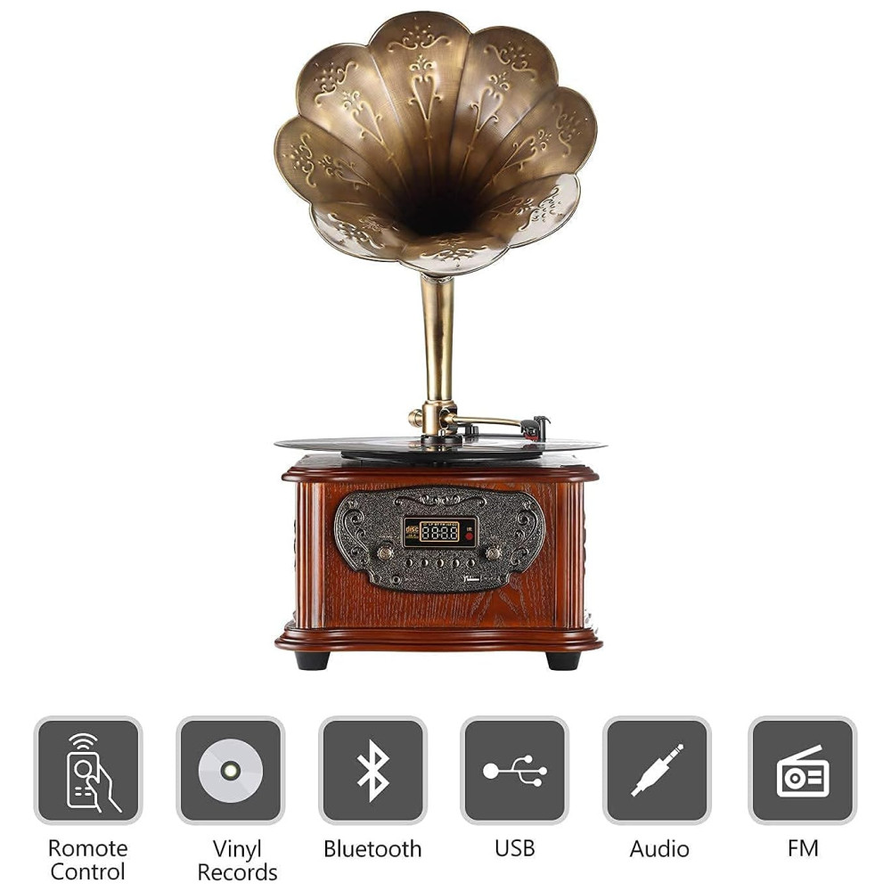 Também pode funcionar como um reprodutor de música e rádio FM com visual vintage com funções de Bluetooth , Aux in , Rádio FM Este gramofone não pode apenas transmitir suas músicas favoritas de seu smartphone ou reprodutor de música via Bluetooth ou com entrada auxiliar de 3,, USB porta de entrada, mas também pode reproduzir as músicas diárias no rádio FM.