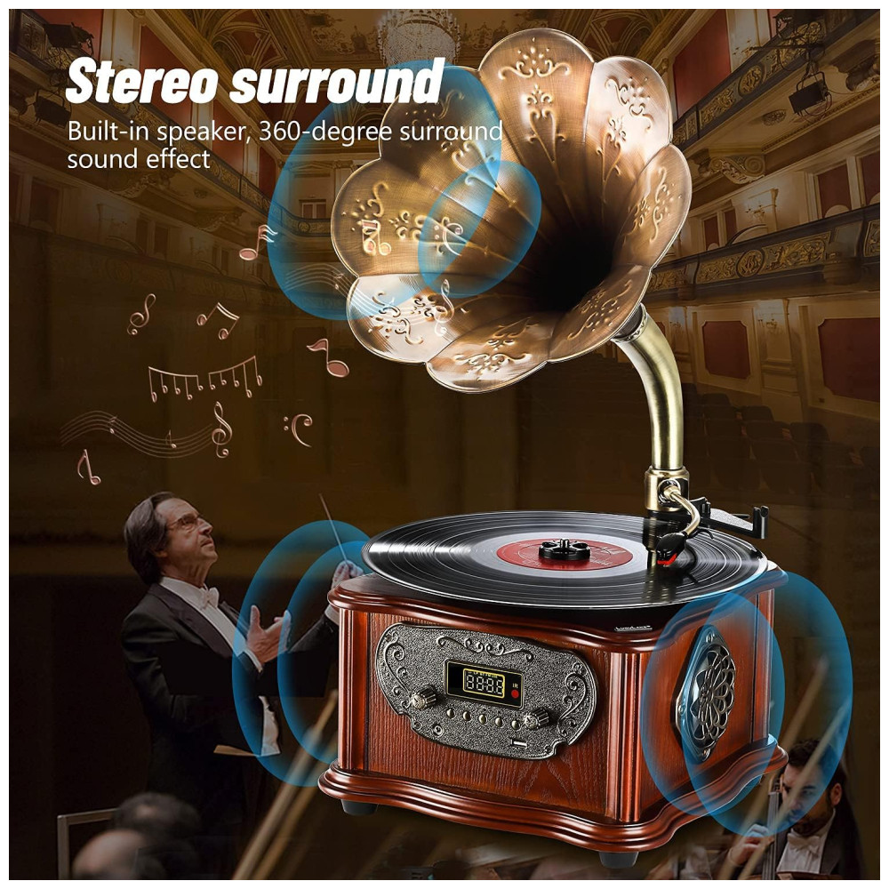 Para oferecer este gramofone com a melhor qualidade, escolhemos o design de acionamento por correia, caneta de rubi e corneta de latão. Você pode simplesmente curtir a música notável com este toca discos de fonógrafo de longa duração.