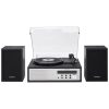 Componentes incluídos toca discos, tampa do toca discos, prato do toca discos, tapete do toca discos, adaptador de 45 RPM, contrapeso do braço, correia de transmissão, transferidor de alinhamento de cartucho, adaptador de energia, alto falantes, fio do alto falante X 2 Ver mais