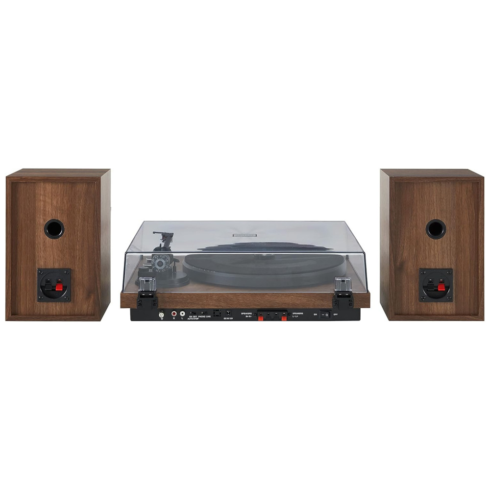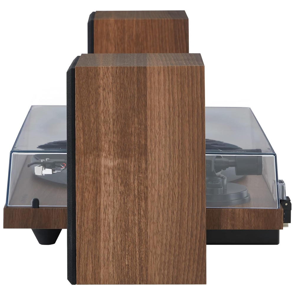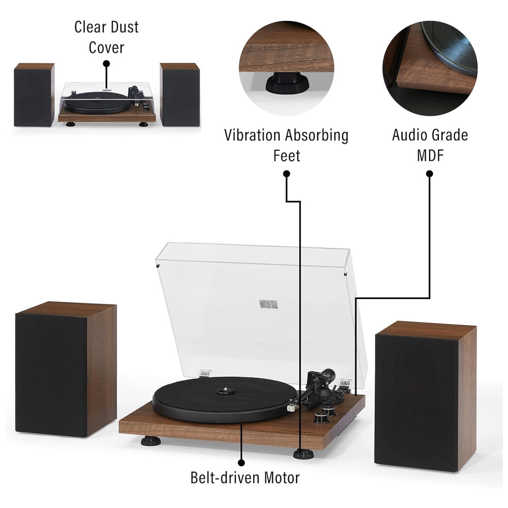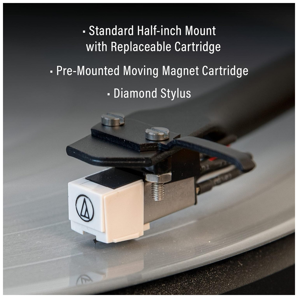 O toca discos possui componentes de alta qualidade, como um braço de alumínio com uma alavanca de sinalização, um contrapeso ajustável e controle antiderrapante, permitindo que você abaixe a agulha do seu disco favorito com confiança. O som é excepcional, instalado sobre um pedestal de MDF de qualidade de áudio, com um cartucho de ímã móvel AudioTechnica pré montado para qualidade de som premium. O motor síncrono de baixa vibração e os pés de amortecimento de ressonância eliminam a interferência para uma reprodução suave.