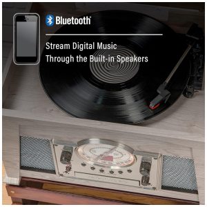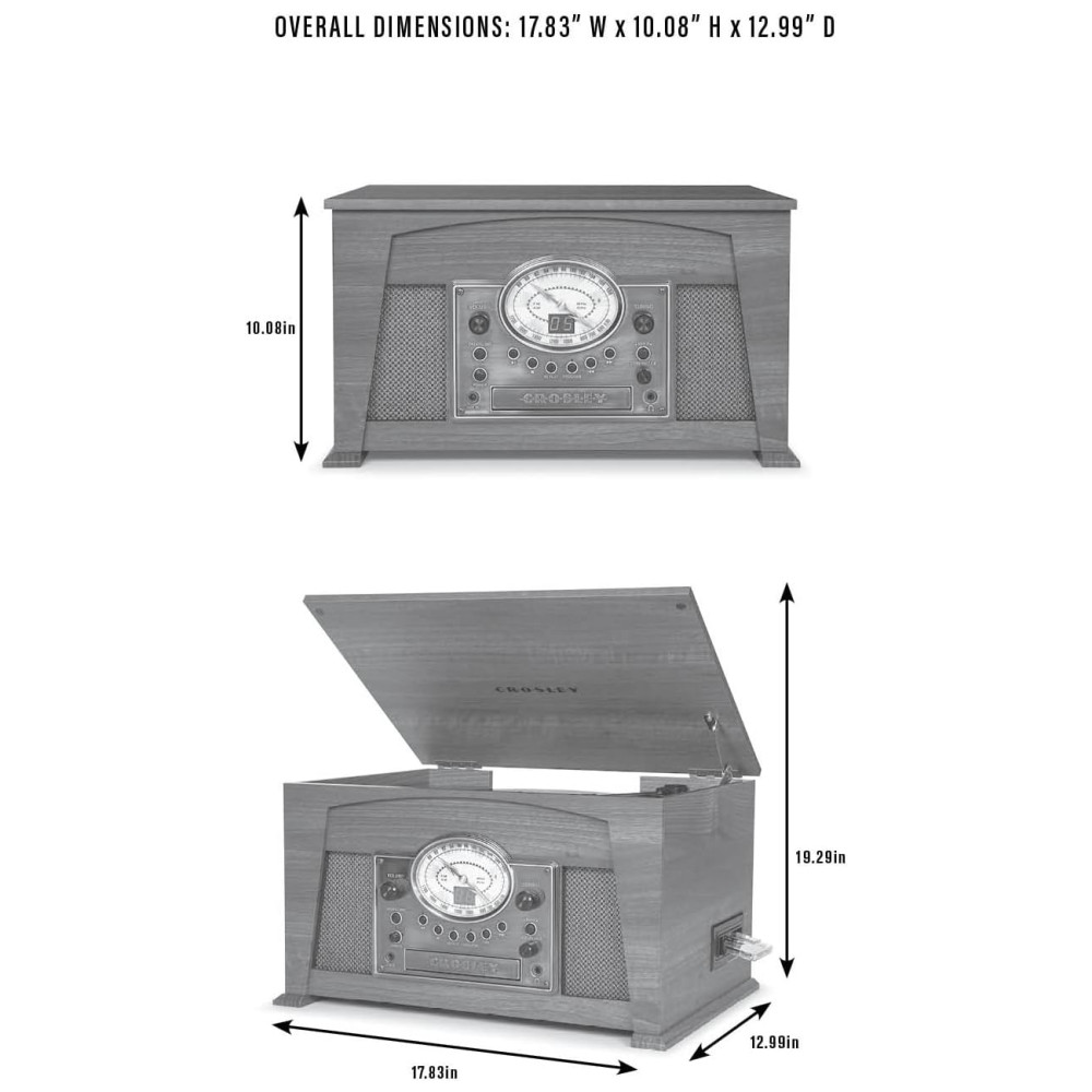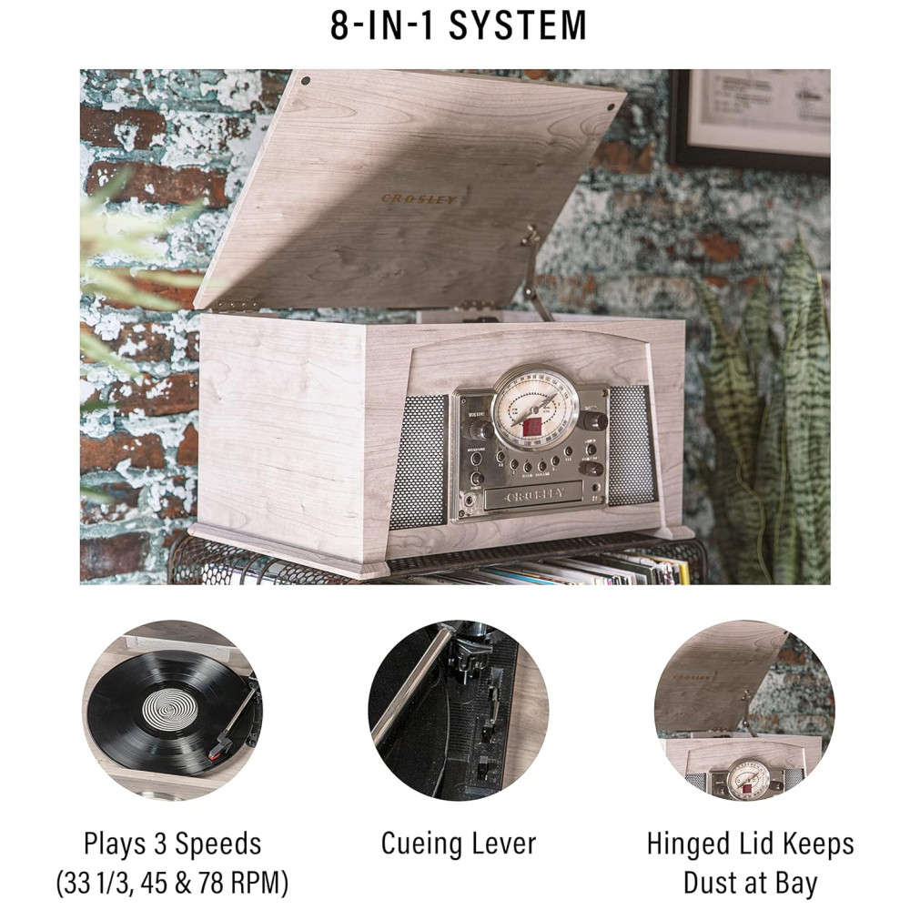 A vitrola toca discos Medley 8 em 1 da Crosley é um sistema de som completo que combina estética retrô com inovações modernas. Com um gabinete de madeira vintage e alto falantes estéreo integrados discretamente aninhados atrás de grades de tecido retrô, este sistema inclui um toca discos de vinil de três velocidades com uma alavanca de sinalização que toca discos de 33, 13, 45 e 78 RPM. Além disso, possui um tocador de CD, um toca fitas e um rádio AMFM. O toca discos também inclui conectividade Bluetooth, permitindo que você transmita música do seu dispositivo móvel através dos alto falantes integrados. O Medley 8 em 1 da Crosley também possui entrada auxiliar e um conector de fone de ouvido para audição privada. Configurar este centro de entretenimento é fácil e pronto em minutos para curtir a audição de vinil com tecnologia moderna. Inspirado em 100 anos de inovações da Crosley, seus produtos combinam visuais vintage com tecnologia moderna.
