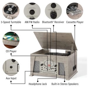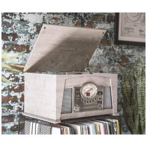 Componentes incluídos toca discos CR7015A GY, cabo de entrada auxiliar de 3,5 mm, adaptador de 45 RPM