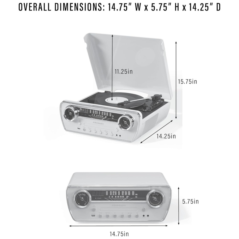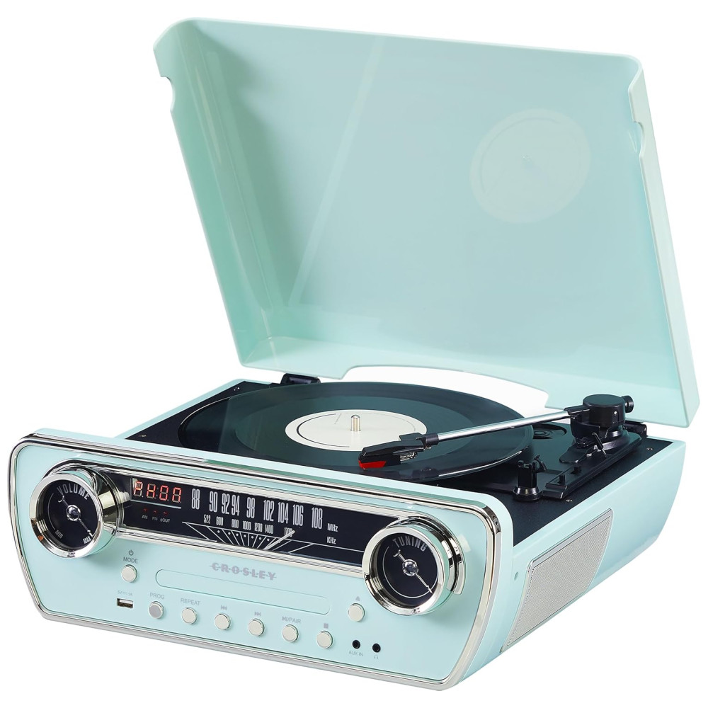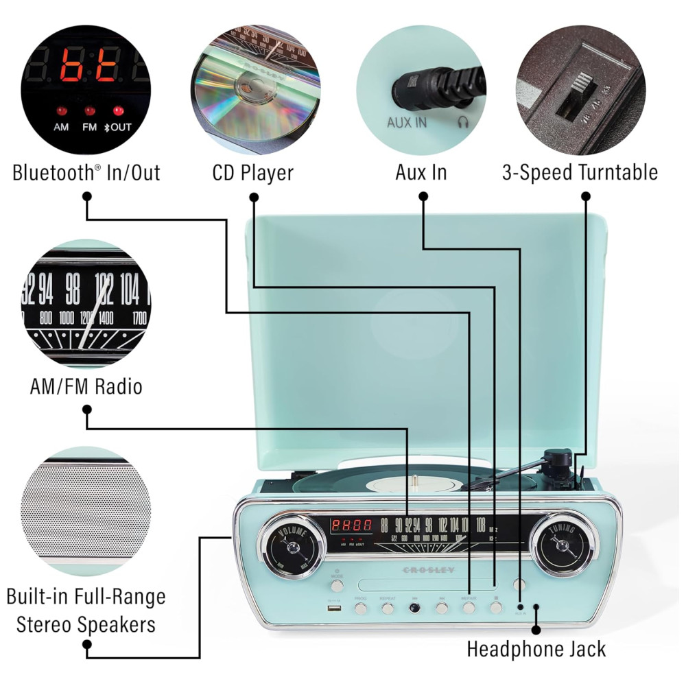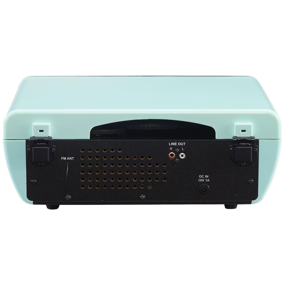 Este toca discos possui três velocidades e um adaptador de 45, permitindo a reprodução de discos de 33, 13, 45 e 78 RPM. Além disso, tem rádio AMFM, tocador de CD e conectividade Bluetooth, possibilitando a reprodução de músicas por meio de alto falantes sem fio ou pelos alto falantes integrados ao toca discos de vinil.