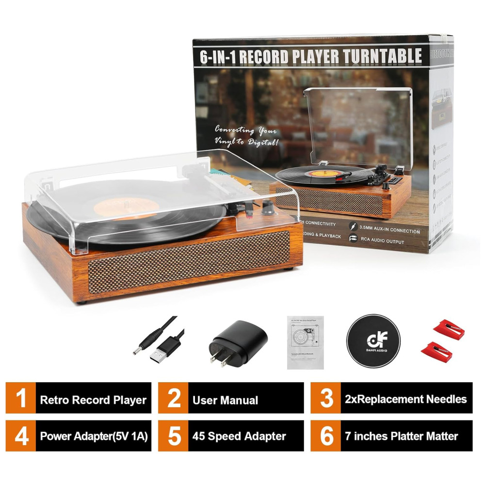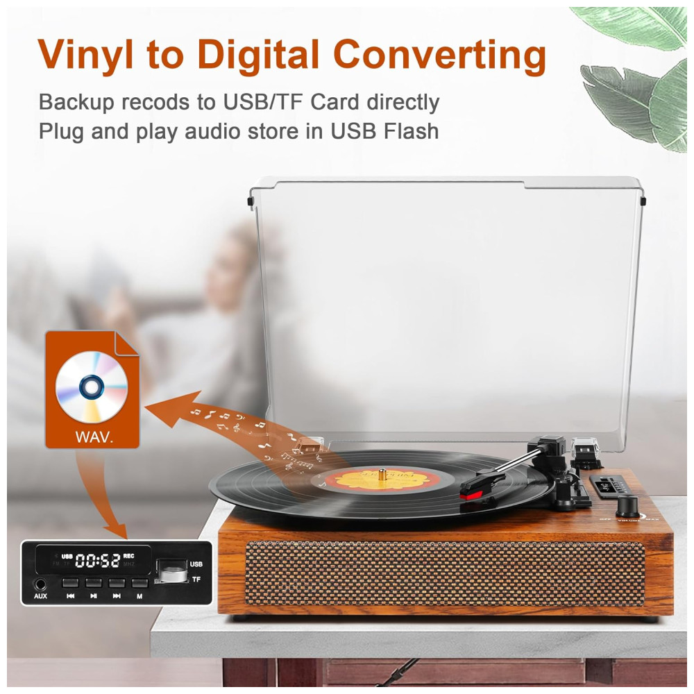 Combinação vintage e moderna Estilo retrô estético combinado com tecnologias modernas. Seus registros podem ser convertidos em arquivos digitais WAV e salvos diretamente na unidade USB, cartão TF. O exterior de madeira artesanal completo com capa de pano na frente, perfeito para decoração de casa