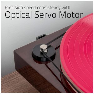 CONTROLE DE VELOCIDADE PARA REPRODUÇÃO DE PRECISÃO O motor isolado evita vibrações e ruídos indesejados, enquanto o mecanismo de controle de velocidade garante velocidade consistente do prato 0,07 Wow , Flutter