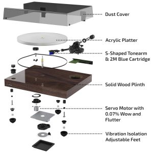 SOLID WOOD PLINTH Deleite se com o lindo gabinete de madeira maciça e os pés de amortecimento de ressonância ajustáveis, garantindo isolamento superior de microvibrações indesejadas Nota pré amplificador phono não incluído