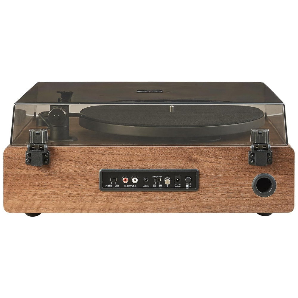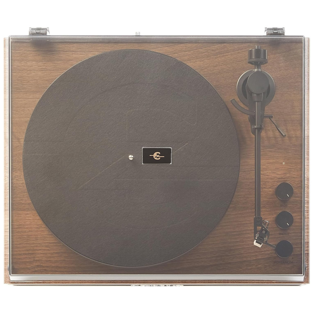 Esta vitrola/ toca discos com acionamento por correia de duas velocidades e parada automática é capaz de reproduzir discos de 33, 13 e 45 RPM em um prato de alumínio de tamanho normal. Ele vem com uma capa protetora contra poeira colorida, um tapete de feltro e um adaptador.
