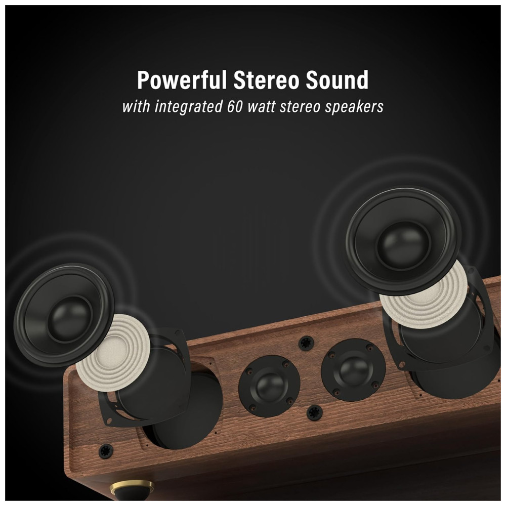 Com controles de equalização, é possível equilibrar os graves e agudos de cada faixa, proporcionando um som excepcional. Os pés de controle de vibração garantem uma reprodução suave e os alto falantes integrados de 60 watts oferecem um som potente. A resposta de frequência varia de 20 Hz a 20 KHz e o consumo máximo de energia é de 36 watts.