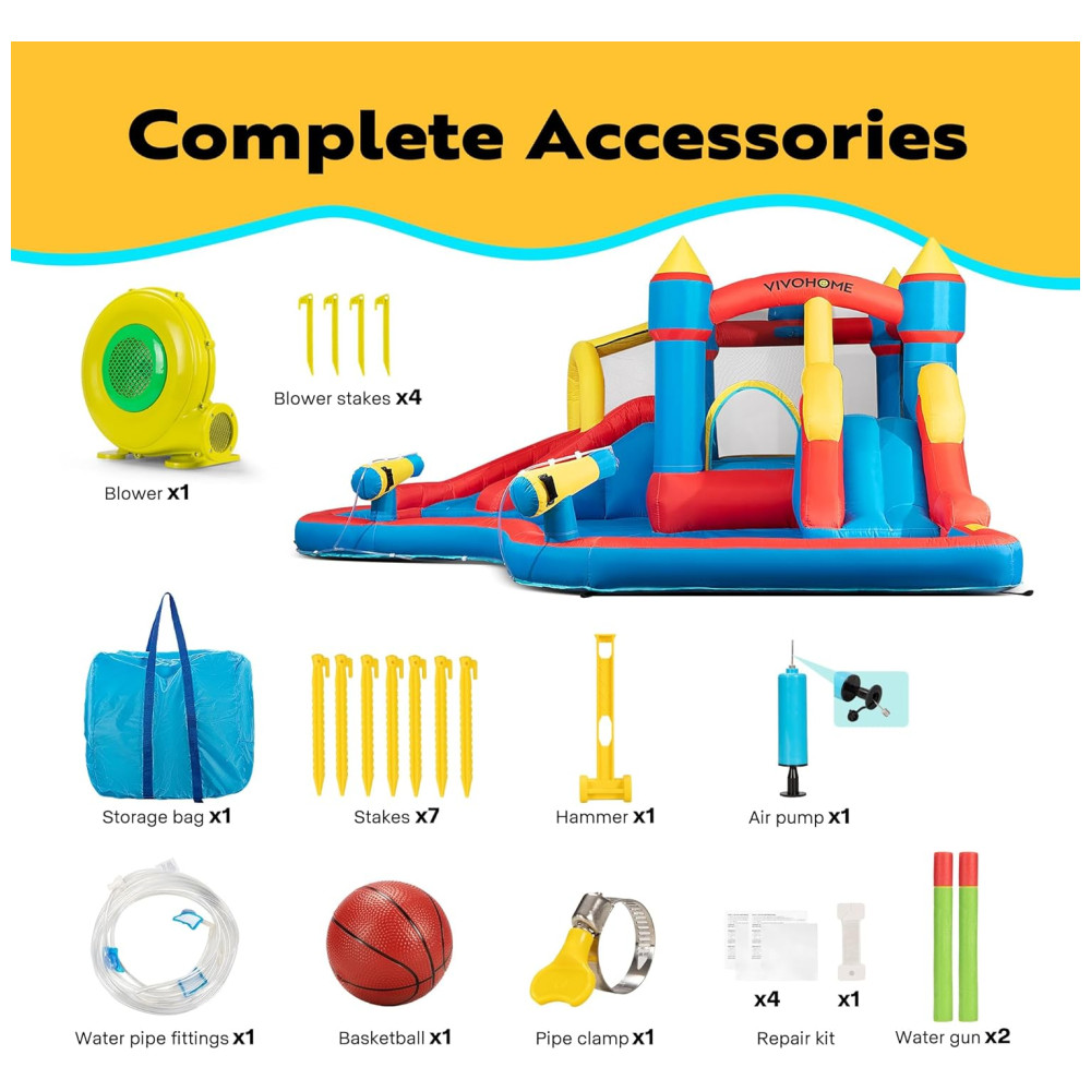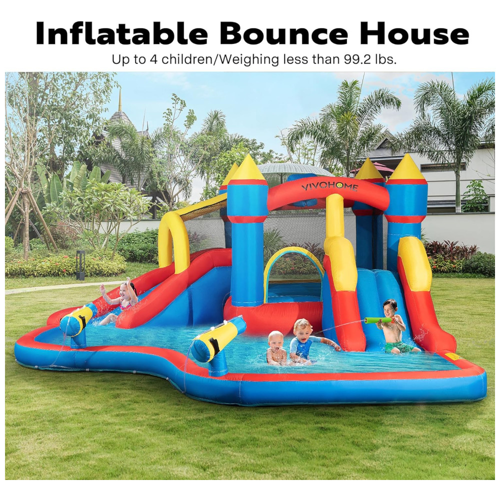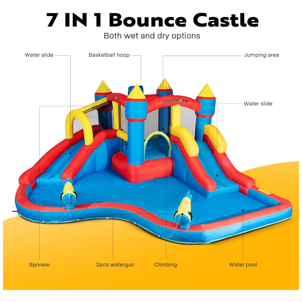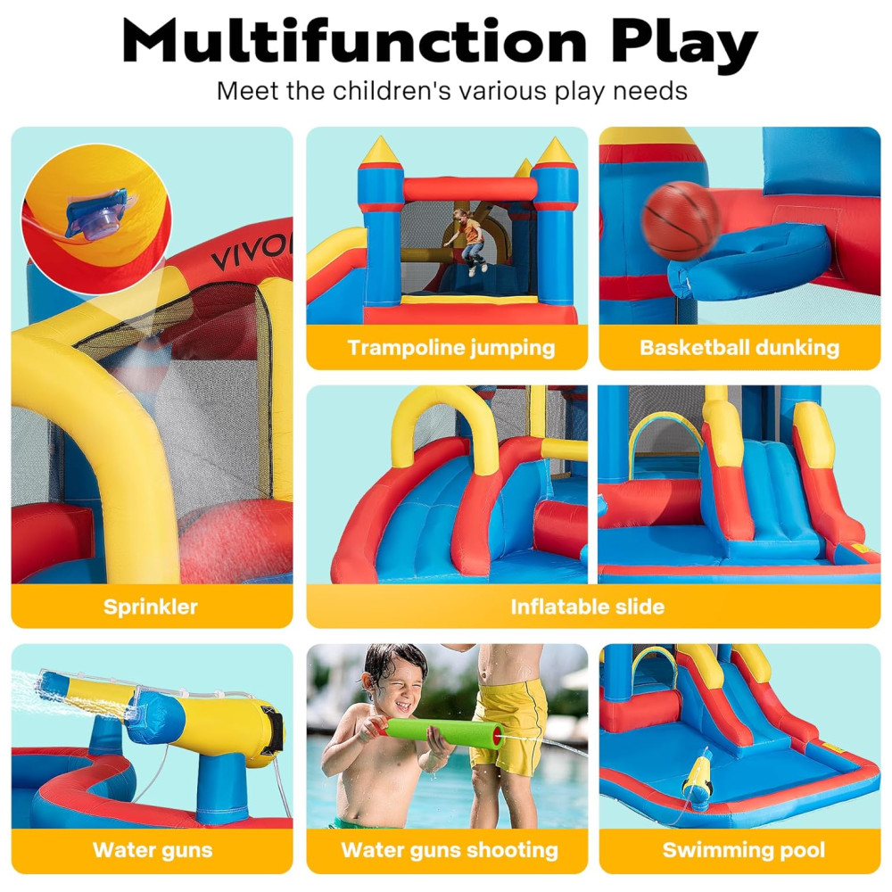 A Casa de Pula-Pula inflável da VIVOHOME é feita com tecidos de alta qualidade 420D Oxford e 840D PVC, com costura meticulosa para proporcionar uma experiência excepcional de saltar para as crianças. Possui uma rede de malha ao redor da área de salto, garantindo máxima segurança e tranquilidade. Além disso, é um espaço ideal para liberar a energia extra das crianças. Este castelo inflável multifuncional oferece opções tanto molhadas quanto secas, combinando trampolins, escorregadores e piscinas para transformar seu quintal em um mini parque aquático. Acompanha pistolas de água, chuveiro e uma pequena bola de basquete para as crianças se divertirem com diversas atividades recreativas. A Casa de Pula-Pula da VIVOHOME vem com um soprador de 450 watts que infla rapidamente e oferece suporte contínuo para evitar colapsos. Inclui também 7 estacas para maior estabilidade, além de um kit de reparo, bolsa de armazenamento e martelo de cola. Com capacidade máxima para 4 pessoas, levando em consideração suas capacidades de carga e dimensões. Recomendamos que crianças com peso não superior a 45kg e com idade acima de 3 anos usem a instalação. Este brinquedo é o presente perfeito para aniversários e festas, onde as crianças se concentram em brincar com os amigos, esquecendo-se de programas de TV, celulares e jogos de computador. Além de proporcionar diversão e exercício para seus filhos, também promove a interação entre pais e filhos.