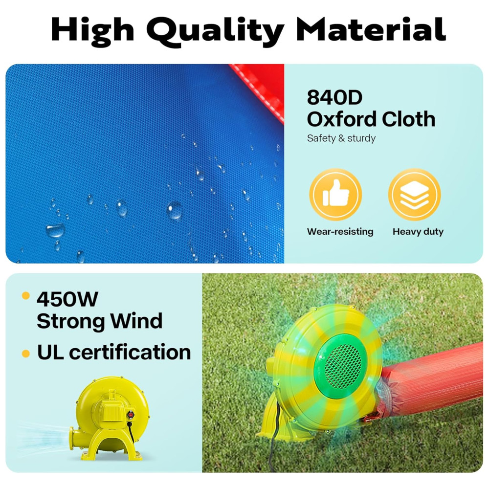 O VIVOHOME 6 in 1 Bounce House para crianças, com piscina grande e escorregador, é feito de tecido Oxford 420D de alta qualidade combinado com PVC 840D, materiais reconhecidos por serem resistentes à água, rasgos e desgaste. O produto apresenta costuras reforçadas para garantir durabilidade e segurança durante o uso em ambientes externos.