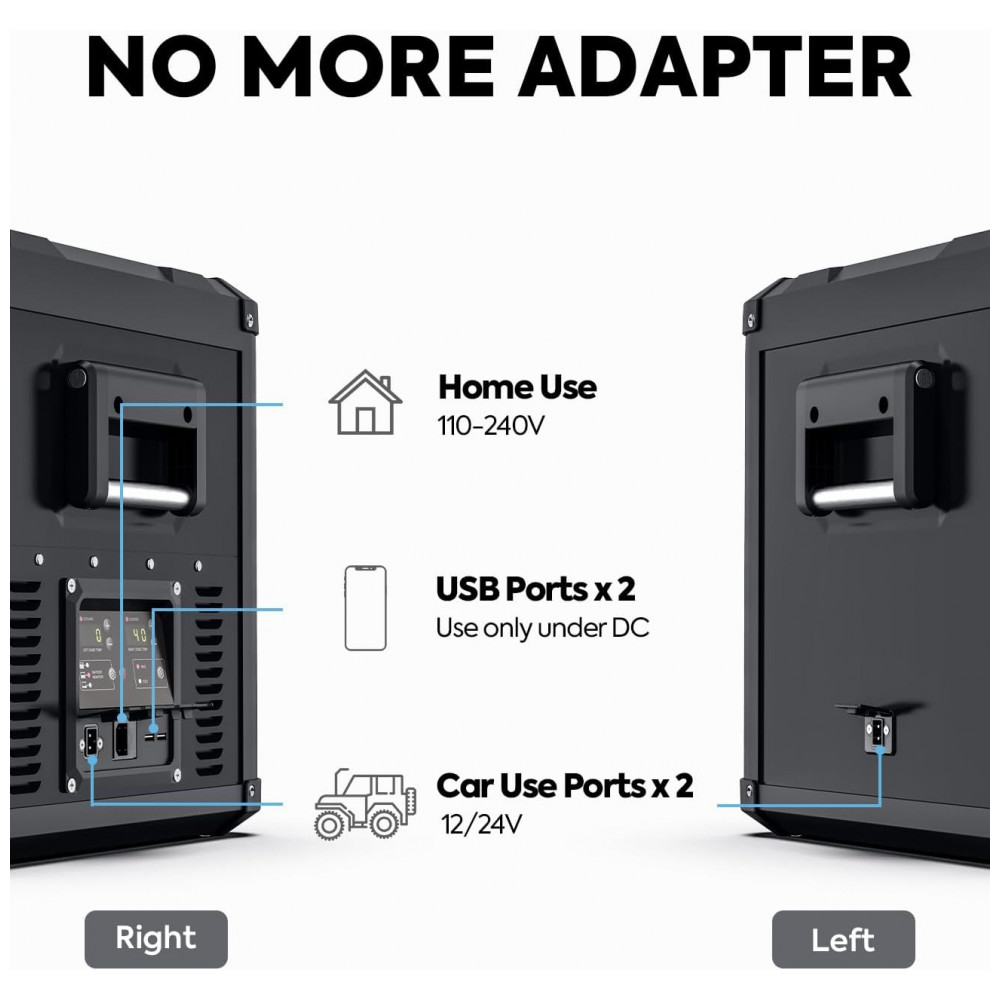 As portas 12, 24 V DC estão instaladas em ambos os lados do refrigerador. 2 tomadas USB projetadas para carregar dispositivos móveis disponível apenas com alimentação DC. O transformador CA integrado permite que você resfrie previamente o refrigerador na tomada de 110 240V da sua casa.