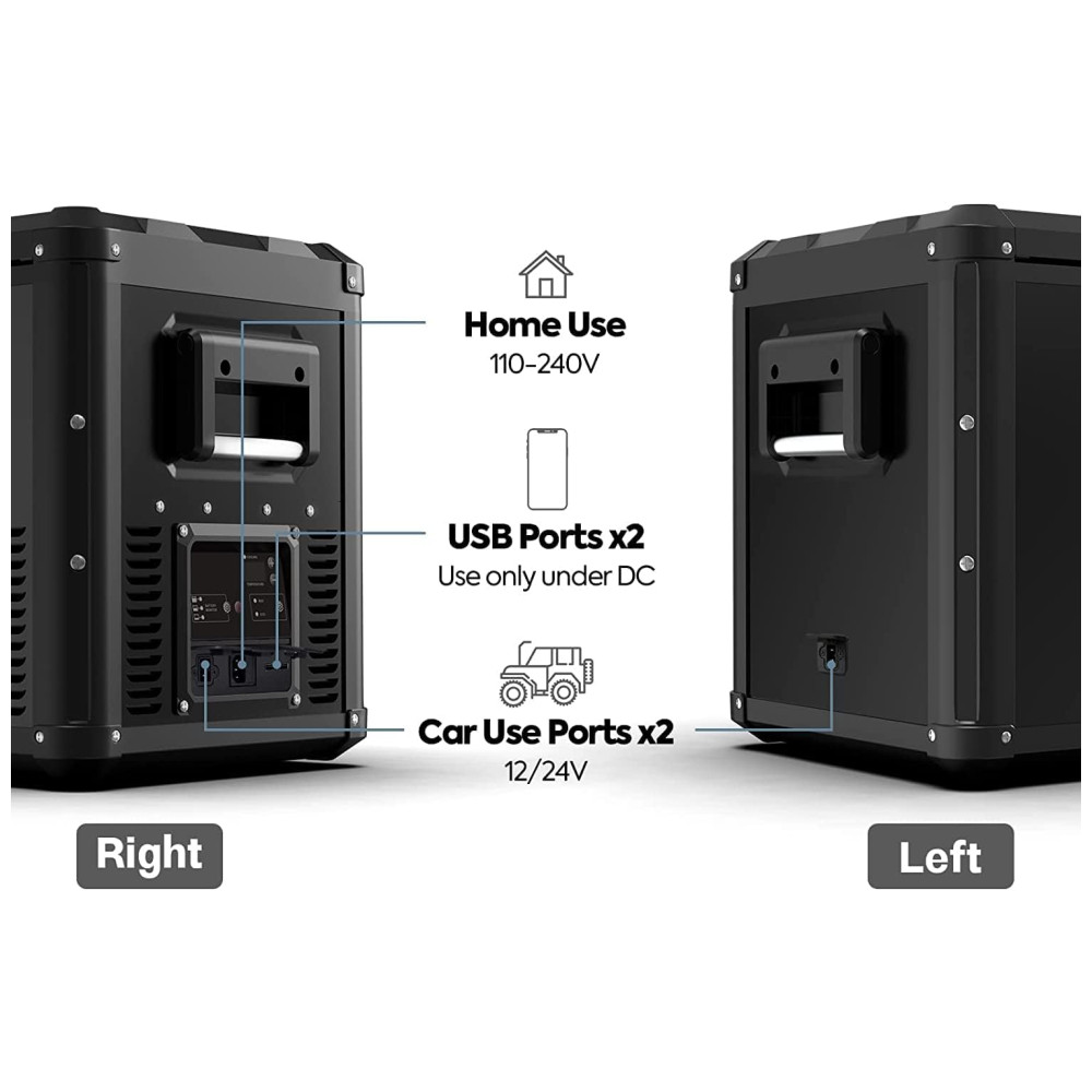 Plugues para portas DC multiuso 12V 24V com ambos os lados para uso fácil de bateria portátil e carro. Porta CA embutida 110 240 V para uso doméstico. Duas saídas USB projetadas para carregar dispositivos móveis disponível apenas quando conectado com alimentação DC.