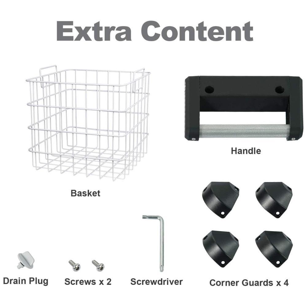 Design atualizado Equipado com orifício de drenagem, defletor à prova dágua, luzes LED e alças de ângulo ajustável removíveis. O pacote também vem com cesta removível, alça de reposição, protetores de canto e bujão de drenagem. A base antiderrapante pode fixar melhor o refrigerador no caminhão.