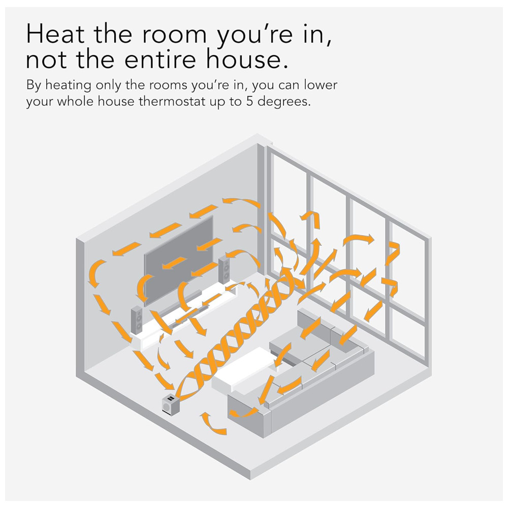 AQUEÇA DIFERENTEMENTE Aqueça suavemente todo o ar em uma sala de pequeno a médio porte por meio de circulação de ar de vórtice sem usar calor intenso, semelhante ao funcionamento de uma fornalha de ar forçado, apenas em uma escala menor.