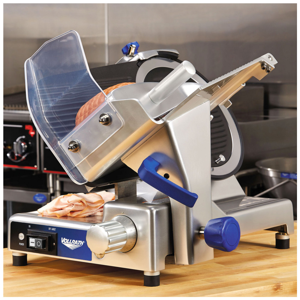 A fatiadora Vollrath 40952 possui revestimento antiaderente na placa de medição para facilitar a limpeza. Com uma capacidade de corte e uma espessura máxima de corte , esta fatiadora é ideal para queijos e carnes processadas. Seu design compacto otimiza o espaço de trabalho disponível, permitindo fatiar queijos e carnes ao longo do dia de forma precisa e consistente. Economize dinheiro processando carnes inteiras e queijos você mesmo! Com um design que reduz a fadiga do operador, possui um alimentador por gravidade de 35 graus que maximiza a produtividade. Equipada com um afiador embutido para uma afiação conveniente, garantindo fatias mais fáceis e rápidas. A placa de medição é revestida com um revestimento antiaderente exclusivo que reduz o atrito, facilitando a limpeza. A espessura das fatias é ajustável permitindo fatiar legumes finos, presunto grosso e muito mais. Feita de alumínio anodizado durável, a fatiadora é fácil de limpar e oferece durabilidade e segurança. O motor de 1/2 hp é perfeito para fatiar continuamente ao longo do dia, incluindo queijos, carnes e vegetais.