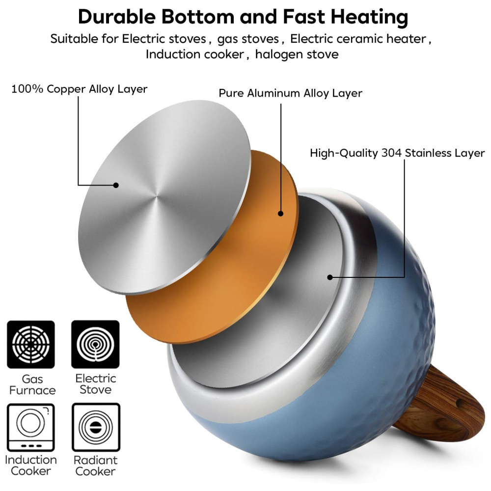 Para vários fogões Bule de fogão adequado para qualquer fonte de calor, incluindo fogão de indução, fogão elétrico, fogão a gás, fogão radiante. Use fogo pequeno ou médio para aquecer o bule, ele aquece muito rápido e economiza energia