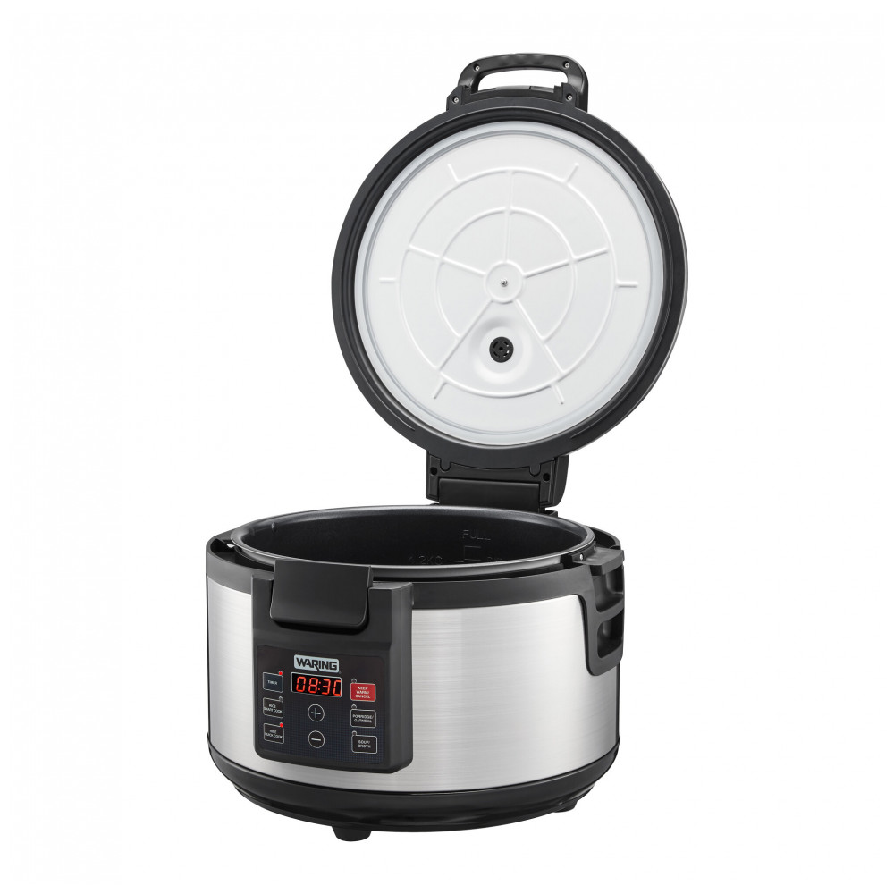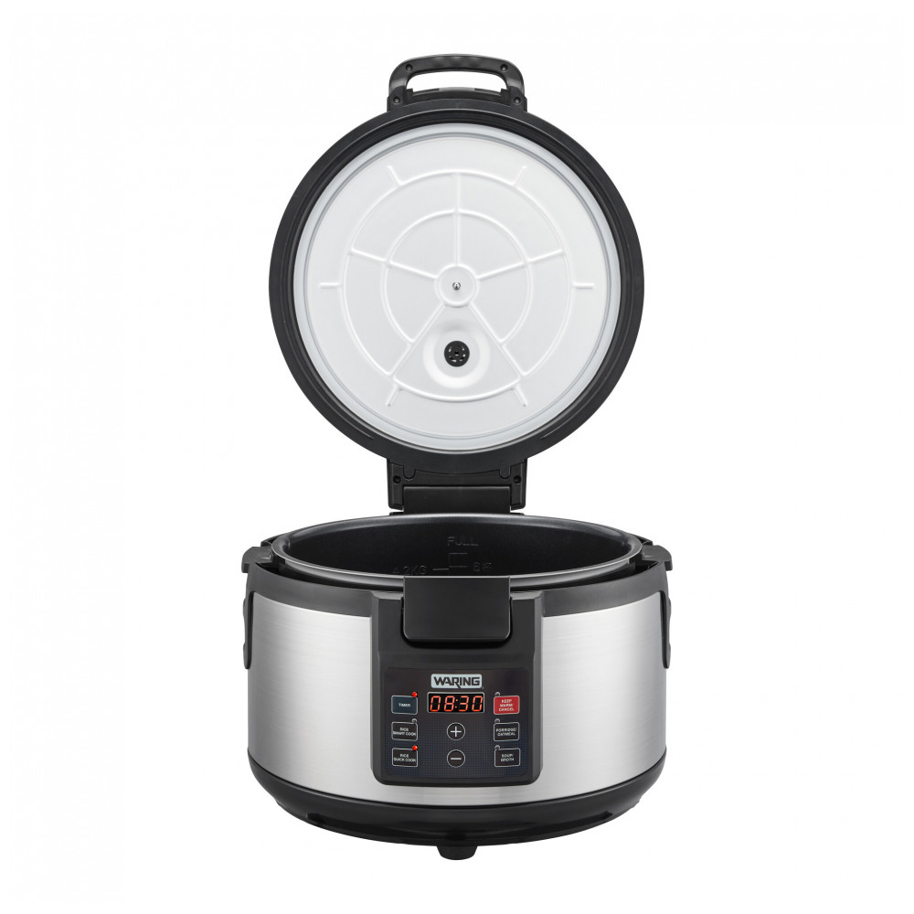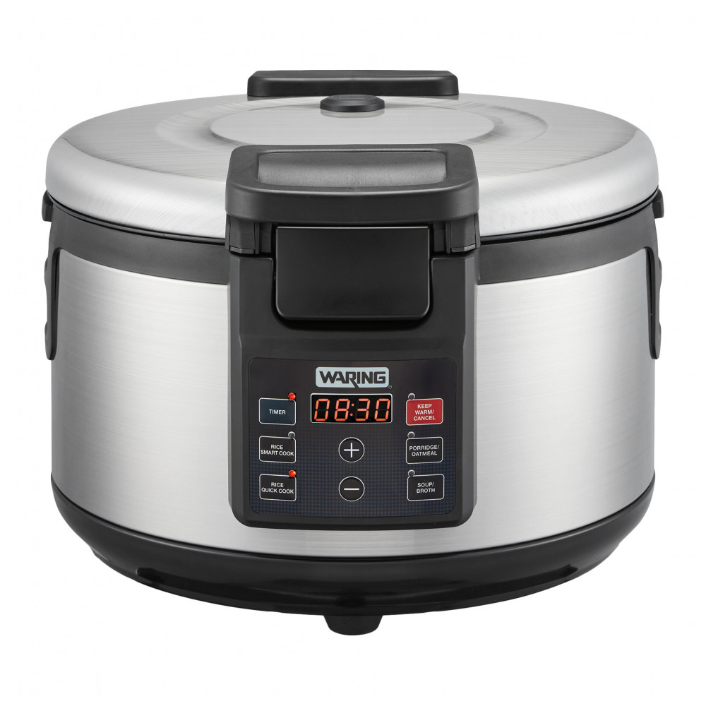O cozedor de arroz elétrico Waring WRC60, com capacidade de 60 xícaras cozidas (30 xícaras cruas), prepara arroz branco, integral ou jasmine, além de aveia, macarrão e sopas em cozinhas profissionais. Funções inteligente (com umedecimento inicial) e rápida (sem umedecimento) ativam aquecimento automático de espera por até 8 horas após cocção, com timer regressivo e controles touch digitais.