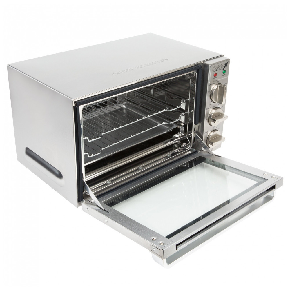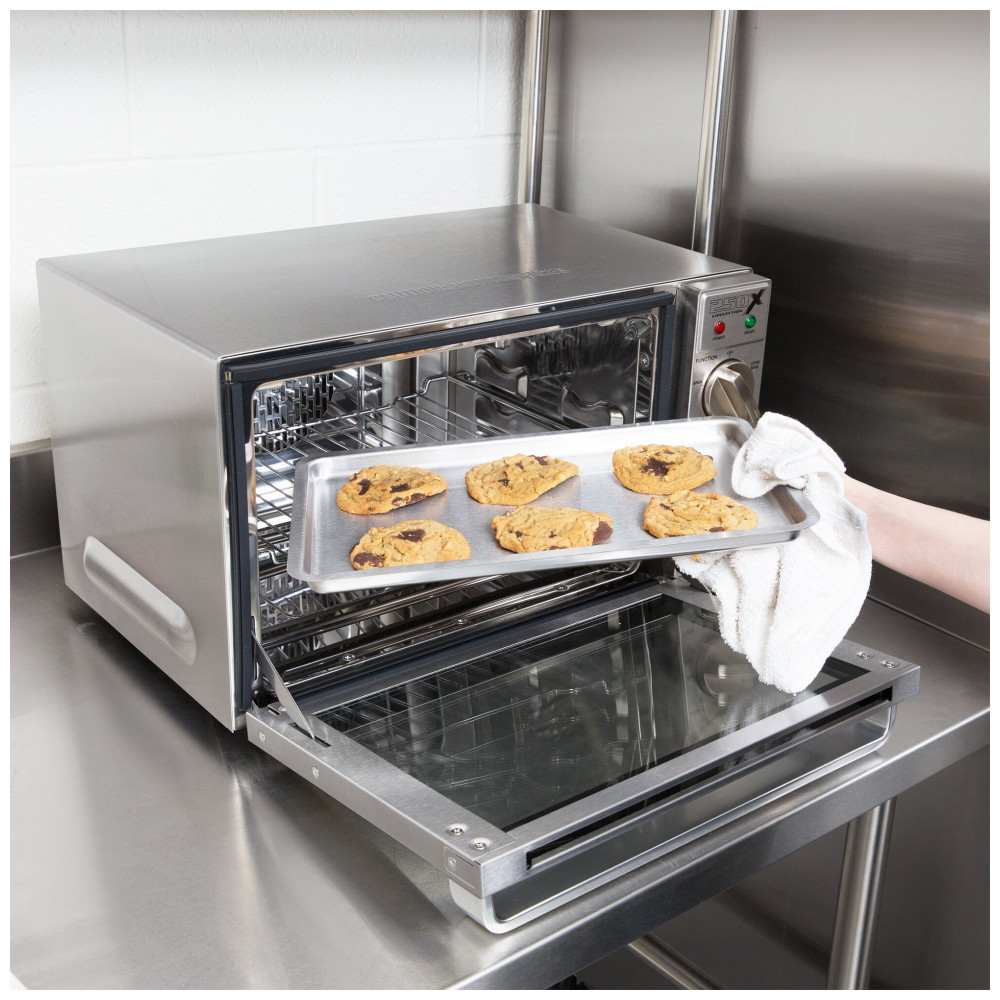 Convecção com 14 A, 60 Hz, monofásico, plugue NEMA 5-15P. Inclui 2 racks cromados e 1 bandeja de aço inoxidável. Temperatura ajustável de 150-500°F (66-260°C).