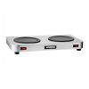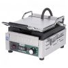 Grelha elétrica Waring WDG250 para panini, sanduíches, frango, vegetais e hambúrgueres em cozinhas comerciais de médio volume. Superfície de cozimento de 37 x 28 cm com placa superior ranhurada e inferior lisa em ferro fundido, equilíbrio automático da placa superior para alimentos até 7,6 cm; termostato ajustável até 300°C, bandeja de gotejamento removível e pés ajustáveis em 110V, 1800W.