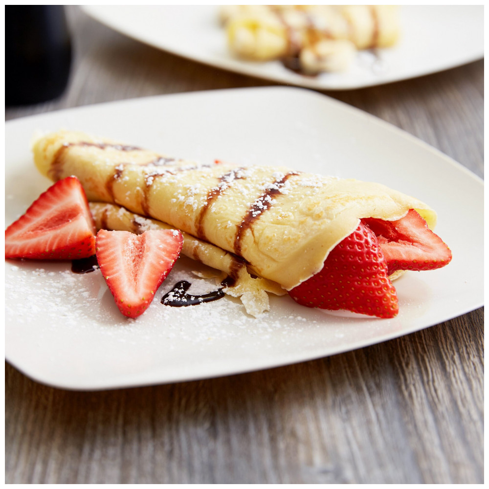 Superfície de cozimento em alumínio distribui calor uniformemente para formação de crepes delicados. Base em aço inoxidável resiste a ambientes de alta umidade e uso intensivo.