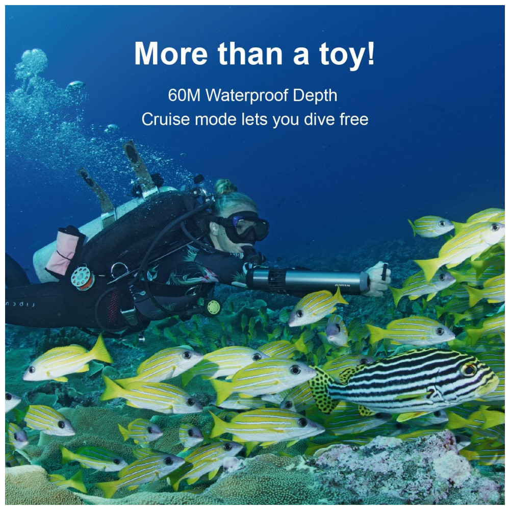 Desfrute de aventuras aquáticas emocionantes com o scooter subaquático Subnado da Waydoo. Compacto e portátil, medindo 37.2 x 24.1 x 6.4 cm e pesando apenas 1,36 kg, é ideal para viagens. Com bateria de 98Wh aprovada para voos, oferece carga rápida de 100W em 1,2 horas. Possui 3 velocidades, modo de cruzeiro por até 56 minutos e carregamento reverso de 100W para dispositivos eletrônicos. Possui sistema de propulsão eficiente que permite alcançar até 60 metros de profundidade. O pacote inclui unidade principal, diversos suportes, controlador de polegar, protetor de segurança, suportes de braço, empunhadura e acessórios para atividades subaquáticas. Os acessórios variados como controladores de dedo e suportes permitem fixação versátil. Seguro e fácil de usar, o Subnado opera até 60 metros de profundidade, possui salvaguarda de dedo removível e é adequado para crianças e diversas atividades aquáticas.