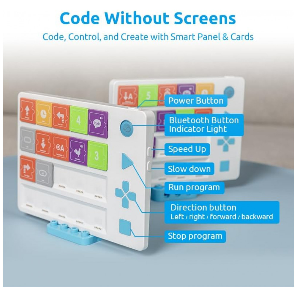 Programação por cartas magnéticas: cada carta representa um comando (frente, virar, som, luz, número, loop etc.), que a criança encaixa em sequência no Smart Panel; o painel executa o “programa” e dá feedback por LEDs, inclusive indicando erros de sequência.
