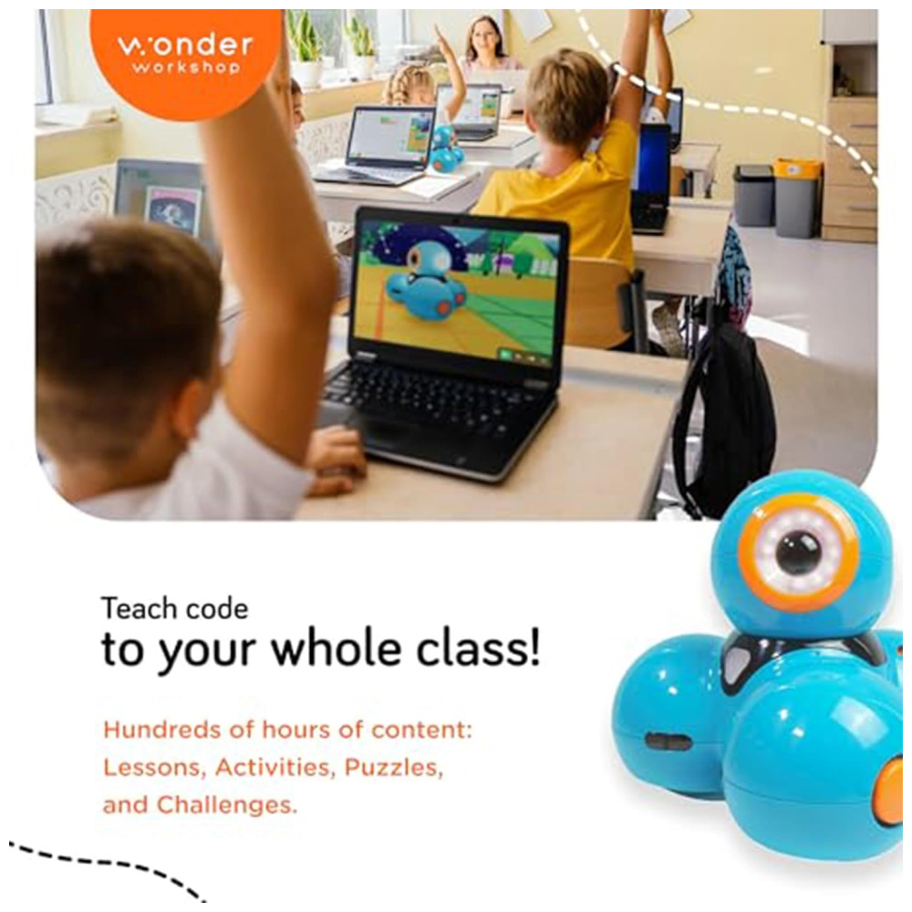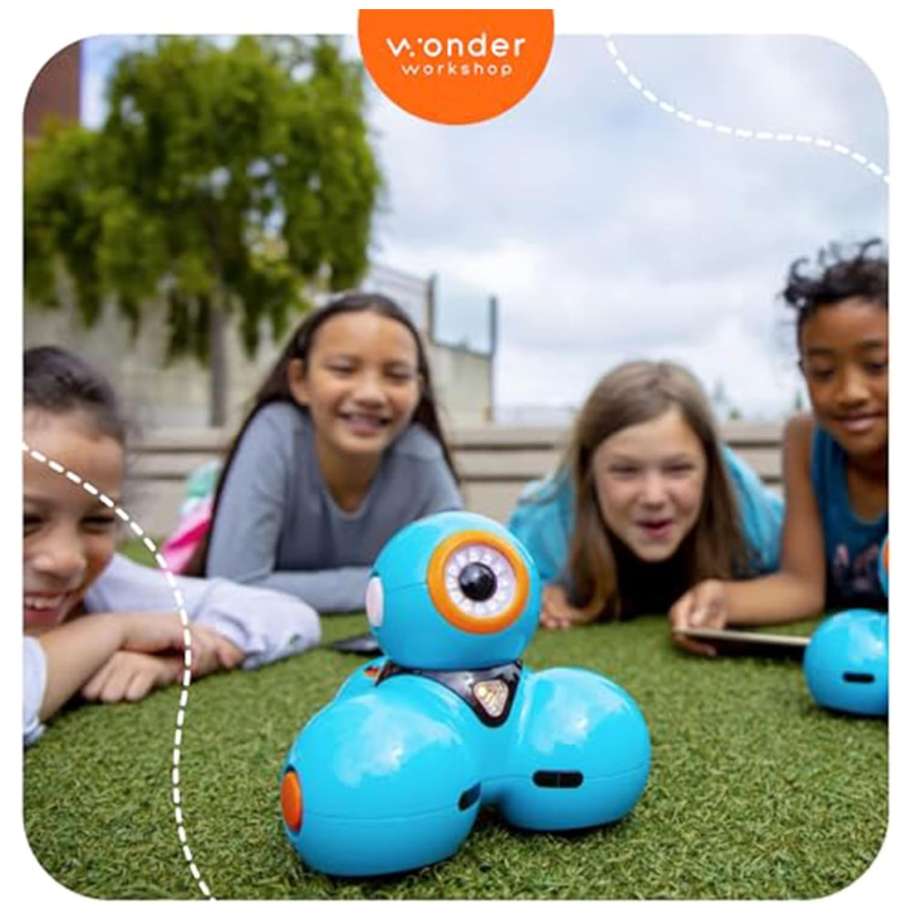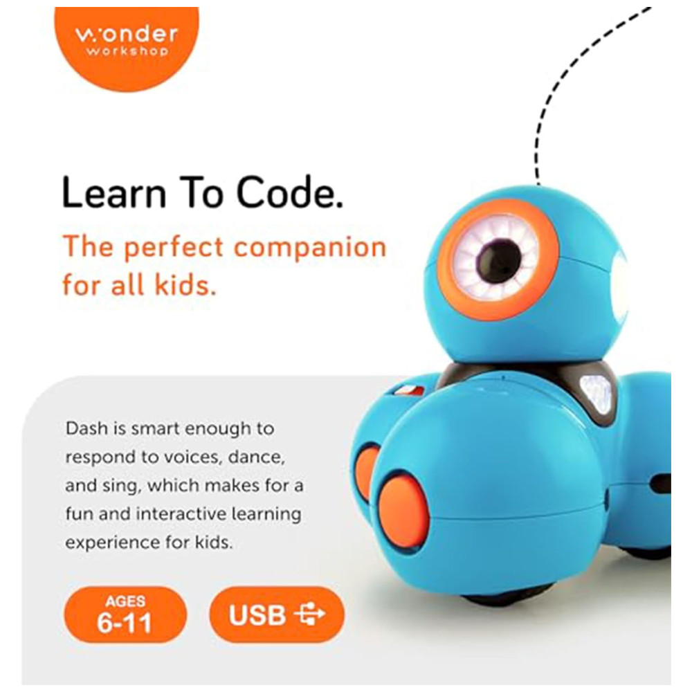 O Wonder Workshop Dash é um robô programável interativo voltado para crianças de 6 a 11 anos, projetado para tornar o aprendizado de programação e STEM divertido e envolvente. Equipado com sensores de movimento, som, luz e voz, o Dash pode ser controlado via aplicativos intuitivos que utilizam programação visual por blocos (Blockly). O robô é capaz de se mover em todas as direções, emitir sons, expressar luzes coloridas, responder a comandos de voz e detectar obstáculos, promovendo uma experiência rica e educativa em programação básica e robótica.