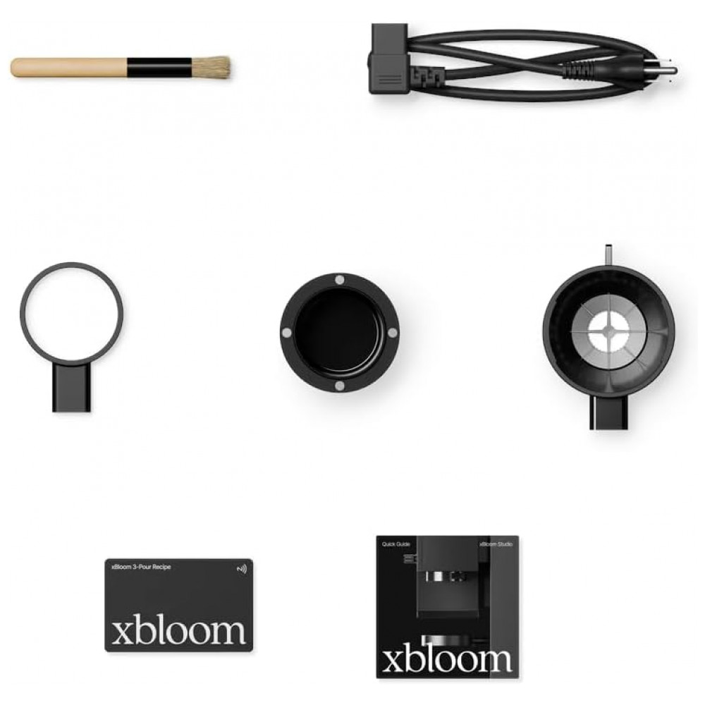 Conteúdo da caixa: xBloom Studio FW-02A-02, Omni Dripper 2 com Hyperflow Bottom, 10 filtros de papel, suporte xPod, copo dosador magnético, escova, cabo universal, cartão de receita padrão e guia rápido.