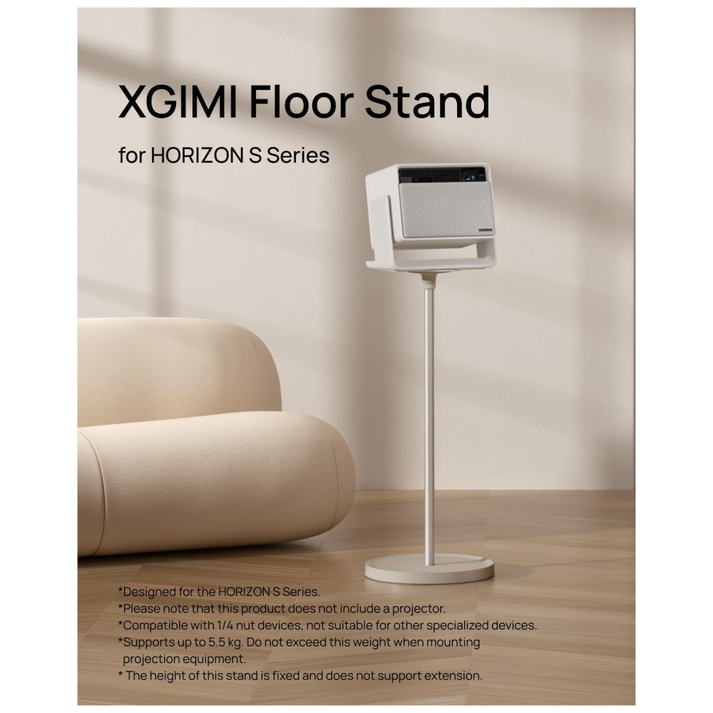 O suporte de piso XGIMI para a linha HORIZON S foi desenvolvido para acomodar projetores da série HORIZON S com estabilidade e acabamento compatível com ambientes residenciais modernos. Fabricado em liga de alumínio, possui estrutura modular que facilita a instalação e integração com o suporte articulado embutido no projetor, permitindo ajuste de ângulo de projeção de forma prática.