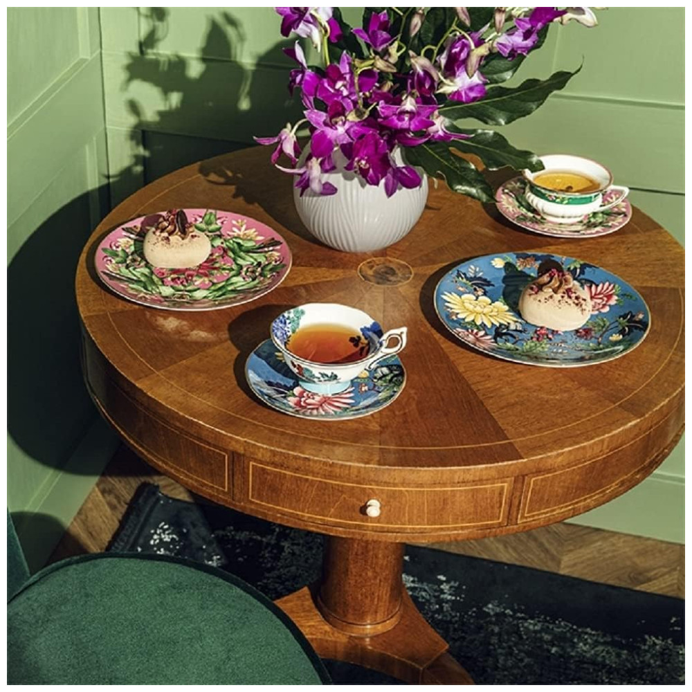 Produzido na Indonésia como parte da coleção Wonderlust, este conjunto combina resistência superior com um design artístico, oferecendo uma interpretação contemporânea de estampas florais inspiradas em viagens globais. A xícara possui capacidade de 0,21 litros e o pires tem diâmetro de 5,9 cm.