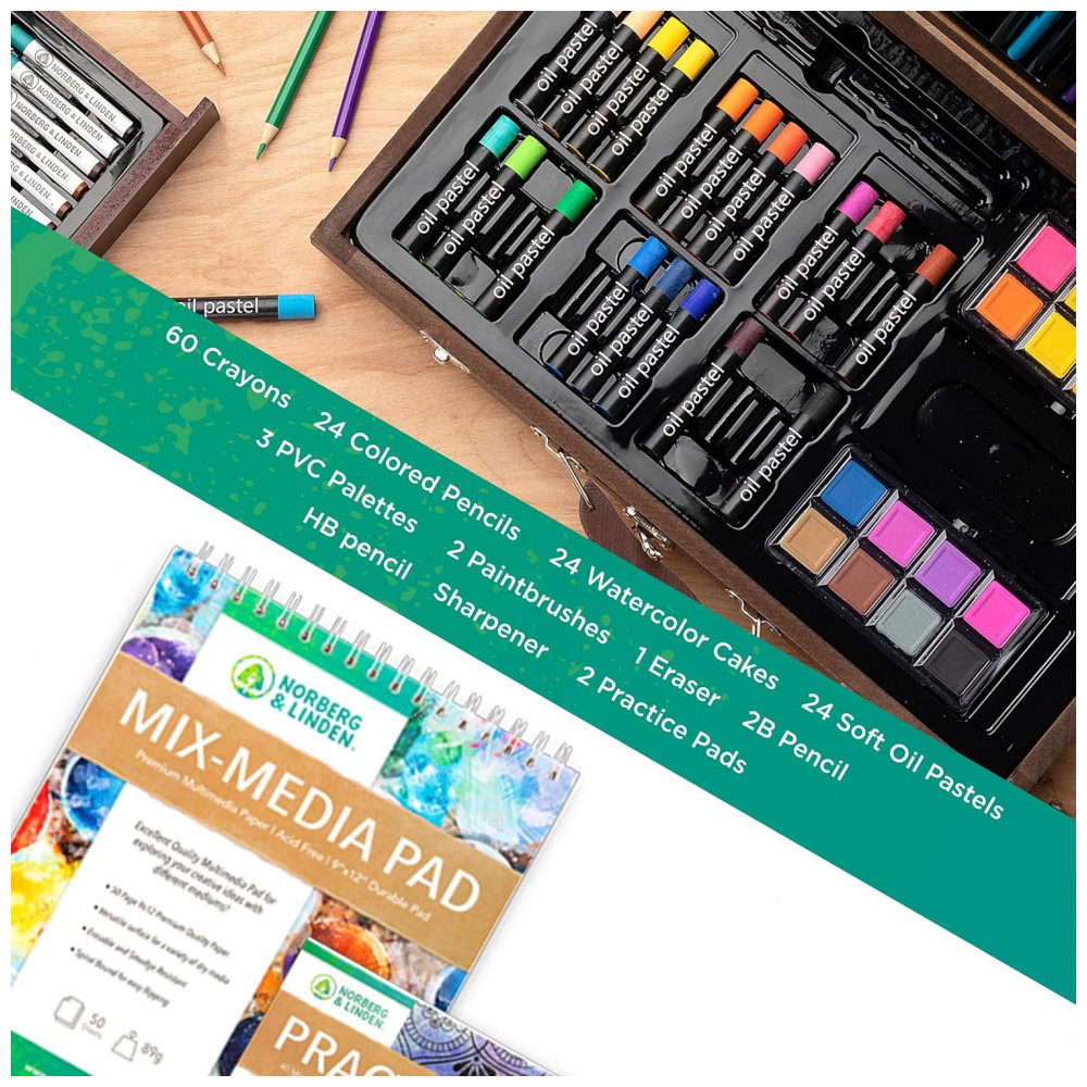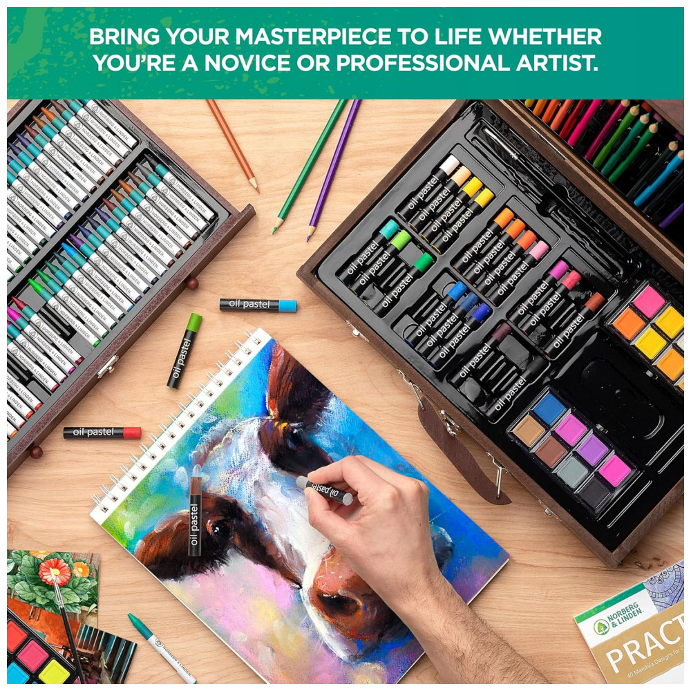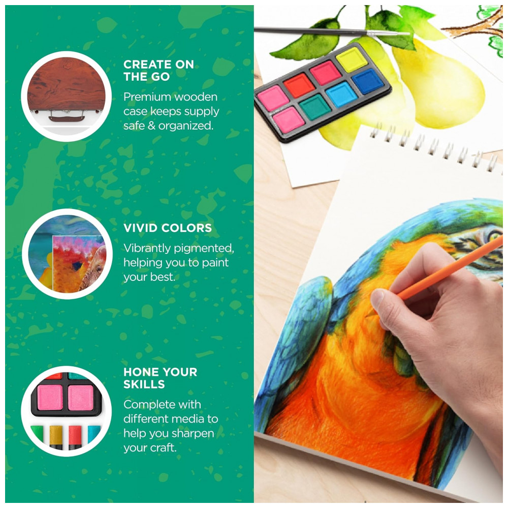 Liberte sua criatividade em todas as suas formas com este conjunto de arte profissional. Aprimore suas habilidades ou descubra seu meio favorito entre o conjunto de tintas aquarela, giz pastel, giz de cera, grafite e lápis de cor.