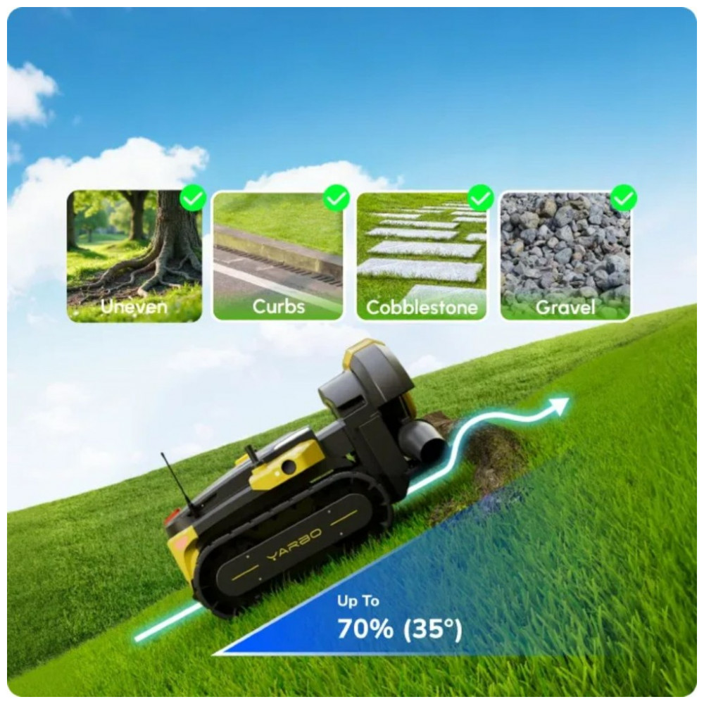 Adaptabilidade versátil ao terreno: conquiste facilmente terrenos complexos — encostas íngremes de até 70% (35°), raízes de árvores, áreas rochosas e superfícies irregulares.