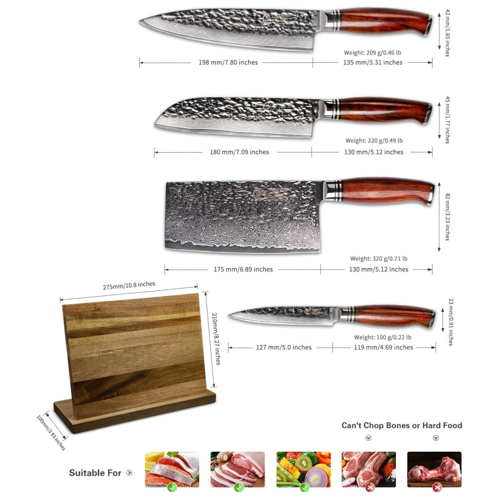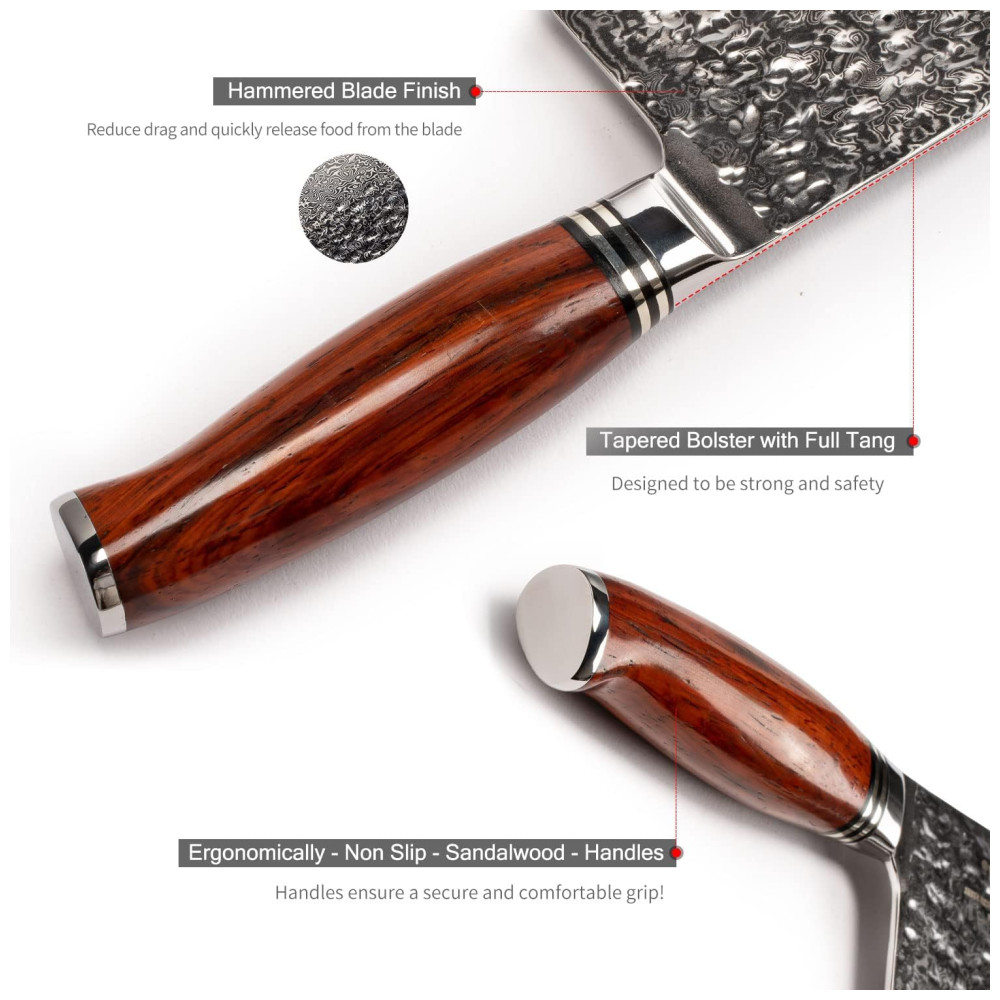 Lâmina de Aço Damasco A lâmina é feita de 73 camadas de aço Damasco o aço de alto carbono 10Cr15CoMoV é selecionado para o núcleo de aço cuja dureza é estável a 60 2HRC, mostrando sua excelência em alta nitidez e durabilidade.
