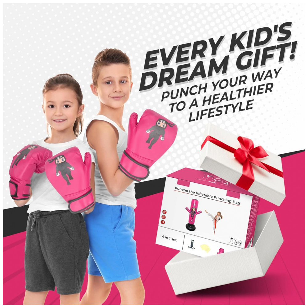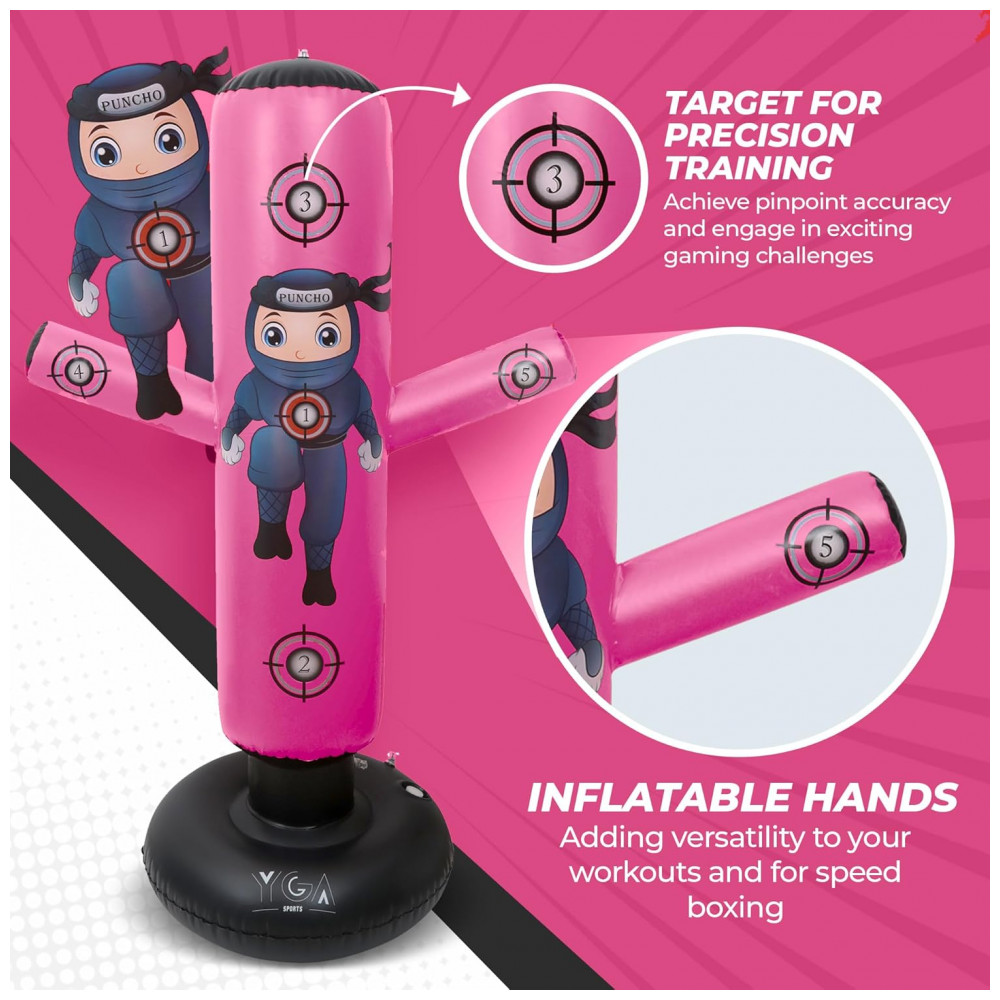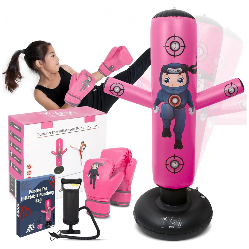 YGA Sports Puncho: Kit Completo de Bolsa de Pancadas Inflável Infantil com Luvas Bomba e eBook – Rosa