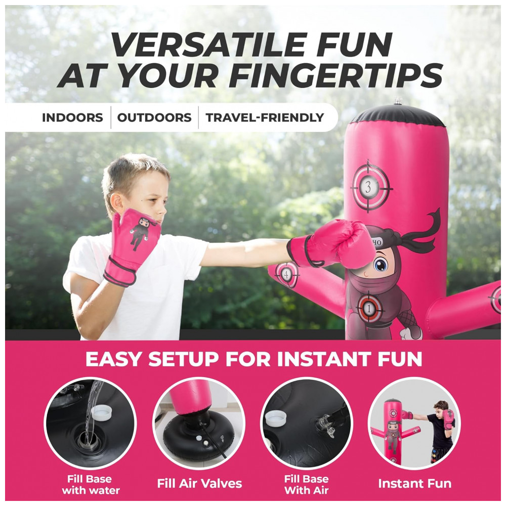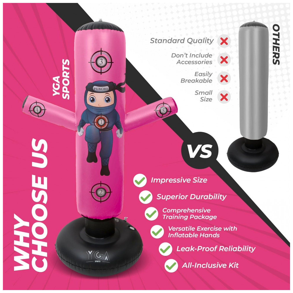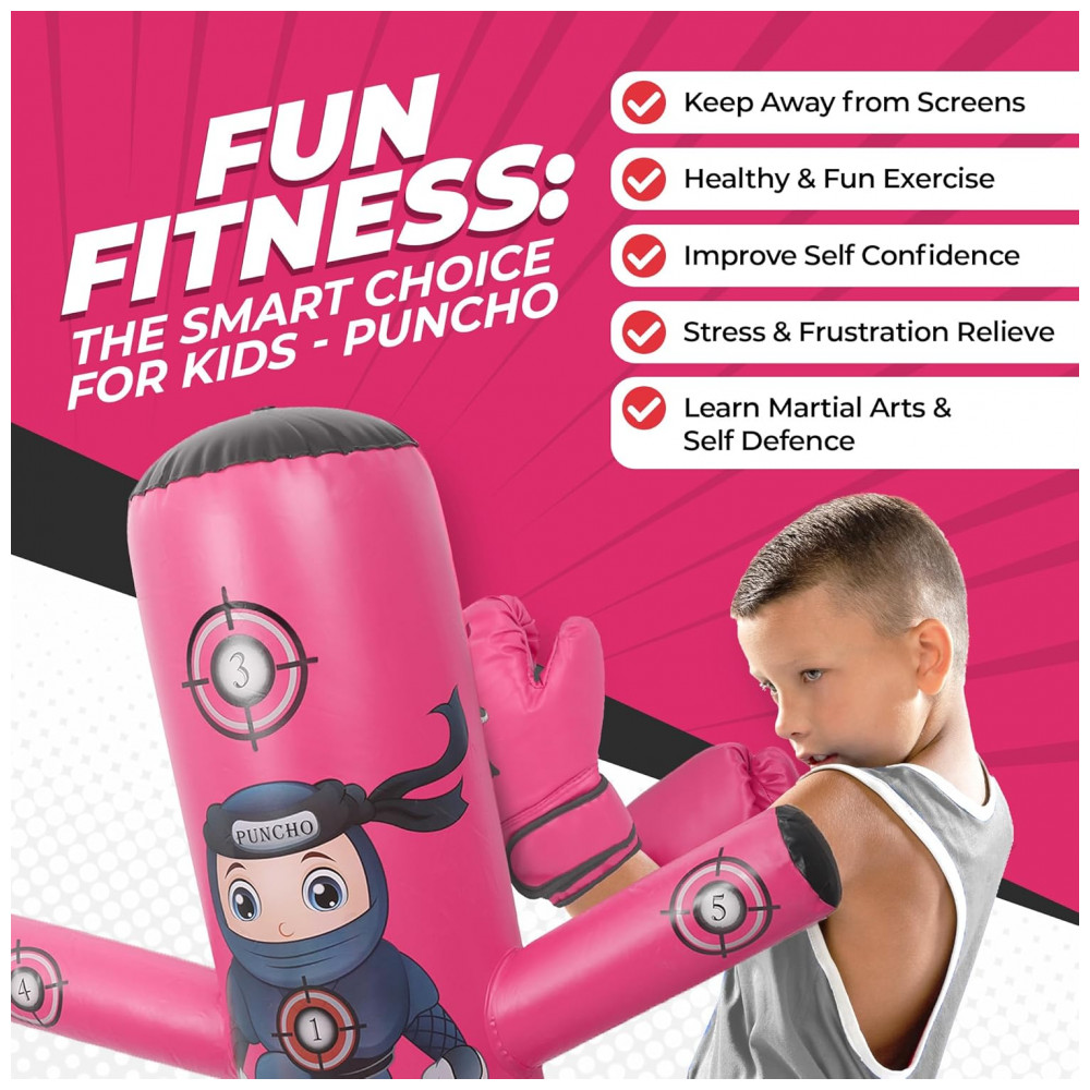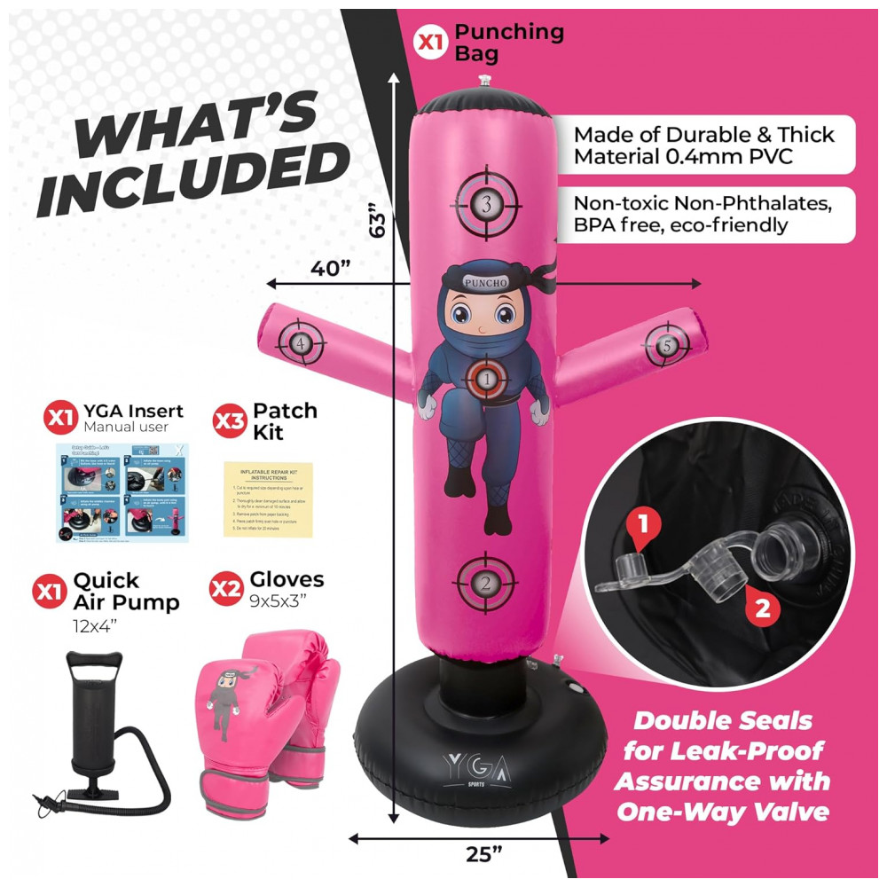 YGA Sports Puncho: Kit Completo de Bolsa de Pancadas Inflável Infantil com Luvas Bomba e eBook – Rosa