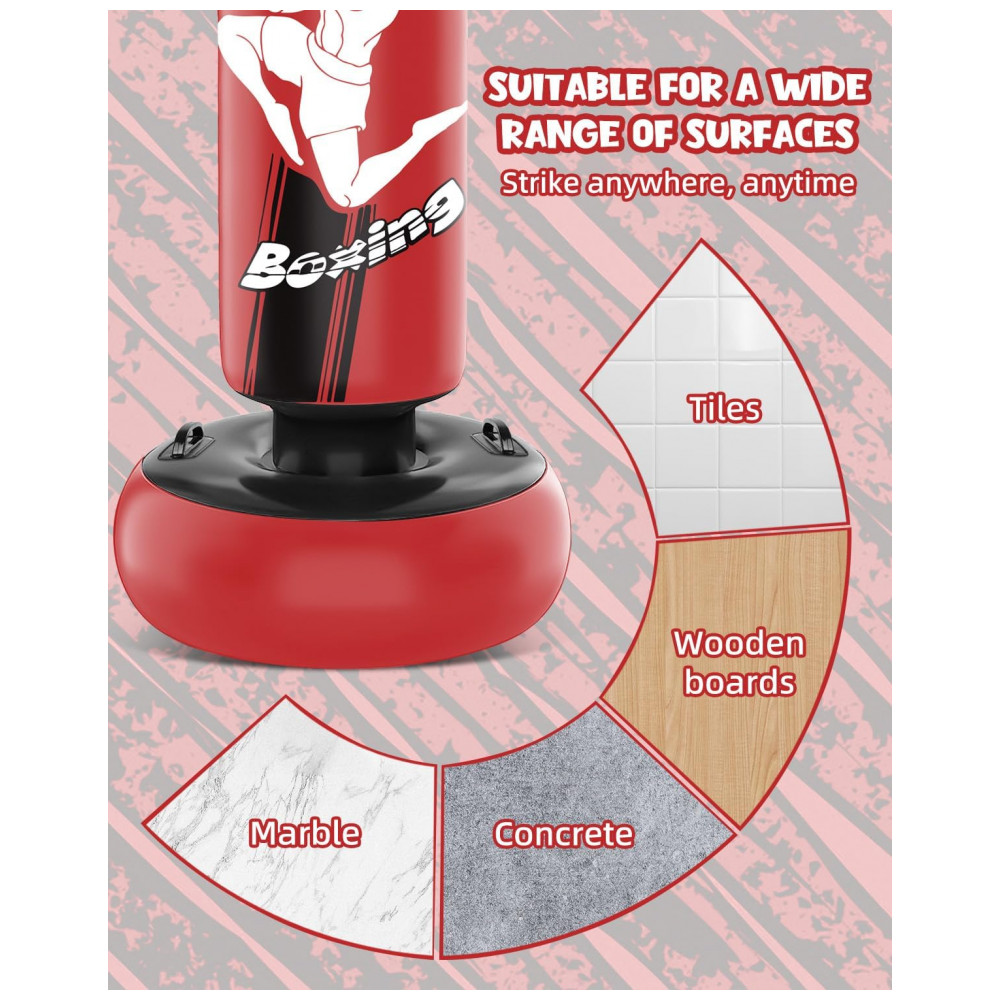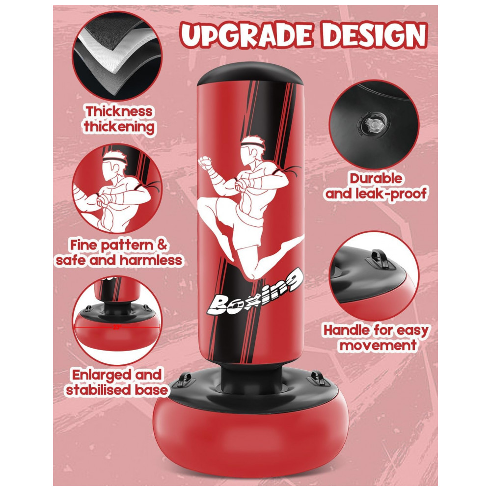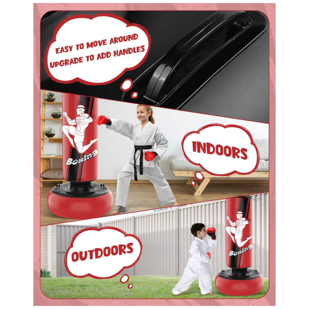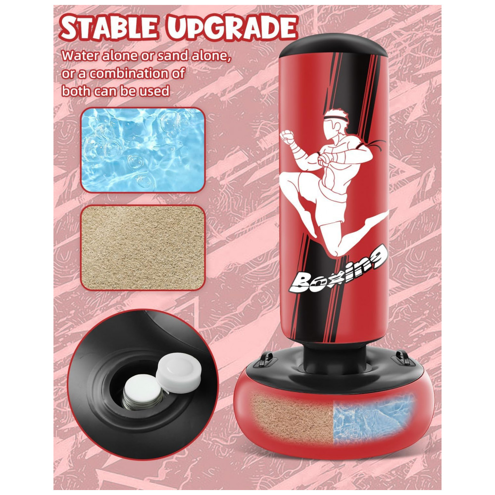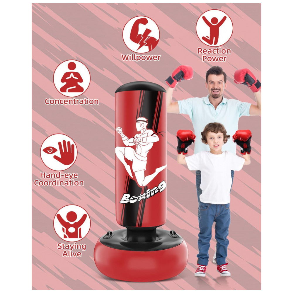 O produto é fornecido com par de luvas de boxe infantis, adequado para treinos recreativos de boxe, karatê, taekwondo e atividades físicas gerais. A estrutura inflável permite esvaziar o conjunto para transporte ou armazenamento quando não estiver em uso.