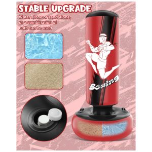 Saco de pancadas inflável infantil YORWHIN, com aproximadamente 168 cm de altura, indicado para boxe recreativo e artes marciais leves para crianças e jovens. Produzido em PVC espesso, utiliza estrutura com três câmaras de ar independentes e base alargada para enchimento com água ou areia, proporcionando estabilidade e retorno após os golpes.