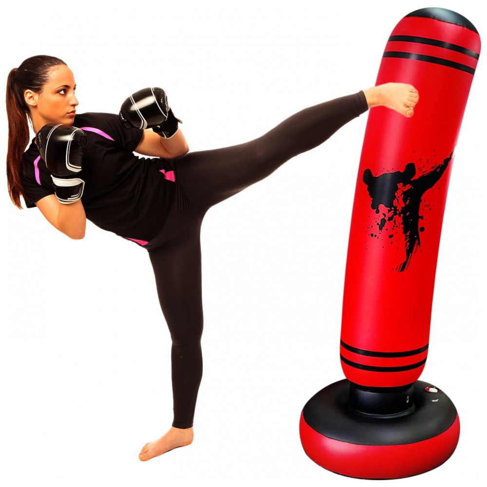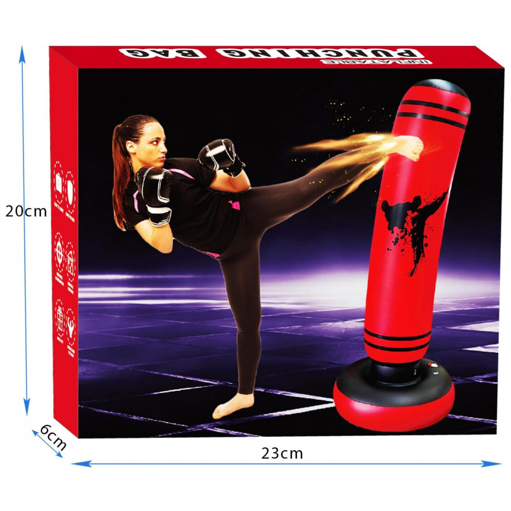 O modelo possui diâmetro aproximado de 30 cm na coluna e base com cerca de 56 cm de diâmetro, oferecendo área de impacto ampla para socos e chutes. A estrutura utiliza bocal de ar com dupla tampa para facilitar inflar e esvaziar o produto, e acompanha remendo para pequenos reparos, favorecendo o uso contínuo em ambientes internos ou externos planos.